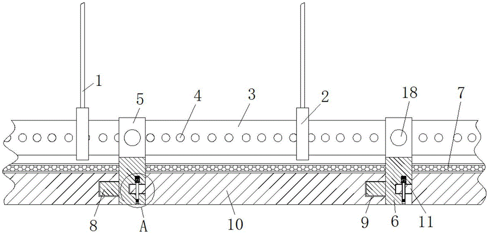 本实用新型公开了一种吊顶用便于更换的装饰板,包括吊装杆,吊装杆的底端固定连接有固定座,固定座固定连接有支承杆,支承杆上套接有若干个滑动卡座,若干个滑动卡座的底端均固定连接有固定卡座,相邻两个固定卡座之间安装有装饰板,滑动卡座上等间距开设有若干个通孔,滑动卡座上前表面对应通孔的位置插接有固定拉杆,且固定拉杆横向贯穿于滑动卡座和支承杆,固定拉杆的外表壁上对应滑动卡座和支承杆之间套接有第二弹簧。本实用新型避免了装饰板采用一体式结构设计,能够自由拆装的,安装时减少了使用很多螺钉进行固定,安装简单,耗时较短,提高了工作效率,同时便于对装饰板进行拆卸更换,且不容易造成损坏。