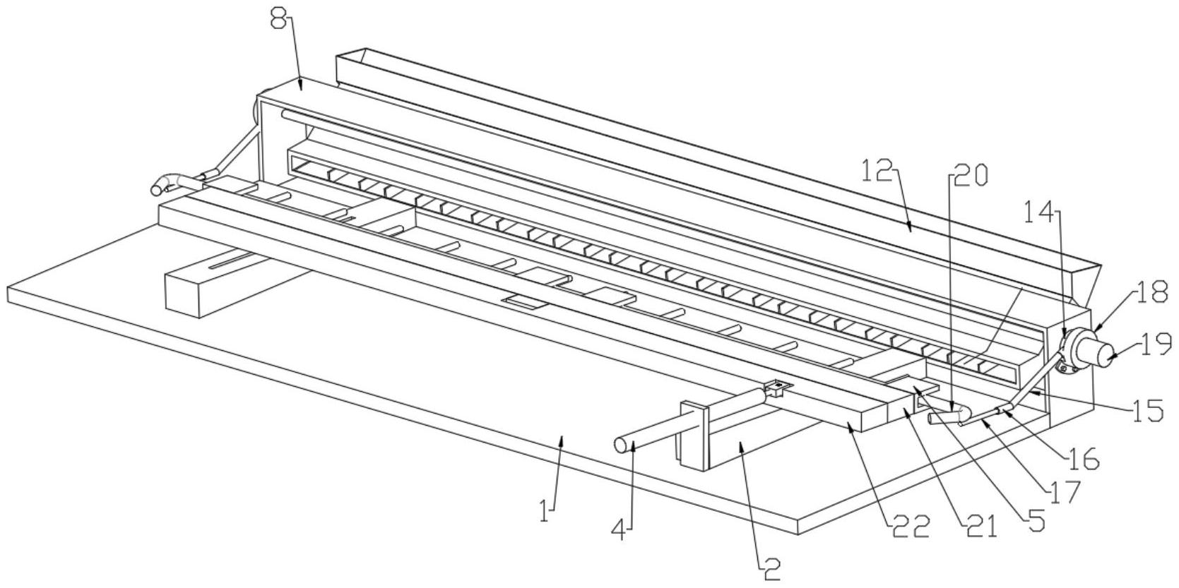 本实用新型提供了票夹组装用进料工装,包括底架,设置在所述底架上的至少两处导座,两导座上通过滑轨设有可沿其顶面移动的滑架,在其中一处导座上固定有电动缸,电动缸的动作杆朝向于滑架方向延伸并连接于滑架,滑架背离于连接电动缸的端面上沿其长度方向设有若干个扣板,进料工装上沿其长度方向设有若干个步距距离相等的插杆,滑架在电缸带动下可将工装架推送到料舱附近,工装架上设置了一排插杆,使得工装架移动至料舱附近时把夹紧扣插放到插杆上,电缸退回后使这些夹紧扣随工装架复位,由此使得这些夹紧扣整挤的排列,将整齐排列的夹紧扣投放到下一工序组装捏杆而完成整个票夹组装时,不会因这些夹紧扣排列混杂而影响工作效率。