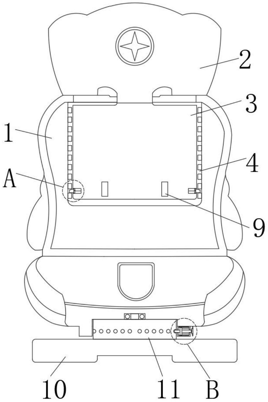 本实用新型涉及儿童汽车座椅技术领域,具体为儿童汽车座椅靠背调节装置,包括汽车座椅本体,所述汽车座椅本体的上侧设置有头靠,且头靠的下侧固定连接有延伸靠背,所述汽车座椅本体的内部开设有空槽,且空槽的内部插设有延伸靠背,所述延伸靠背的左右两侧分别开设有矩形槽,且矩形槽的内部皆横向连接有第一弹簧,所述矩形槽的内部设置有限位块,且限位块的内端与第一弹簧的端头固定连接。本实用新型设置有延伸靠背和限位块,可对靠背的高度进行调节,以适应不同体型儿童乘坐,设置有底座和连接杆,以便于儿童上下车,同时便于成人更好的与儿童互动并照顾儿童。