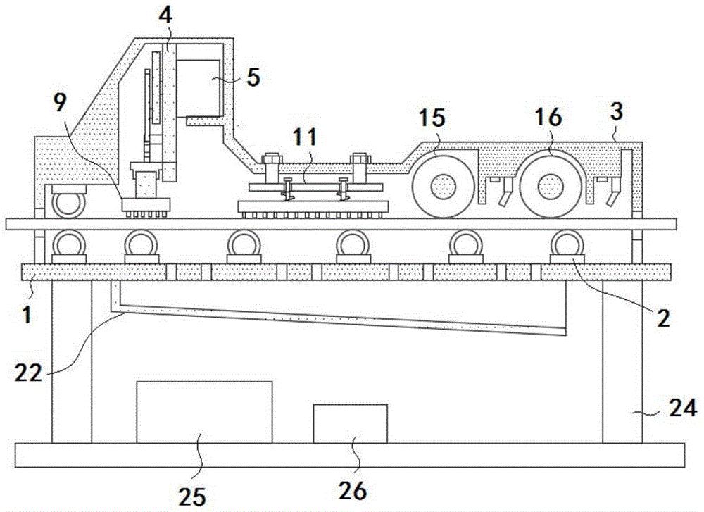 本实用新型公开了一种家具生产用板材清灰装置,涉及清灰装置技术领域。本实用新型包括工作台,工作台一表面固定连接有传导组件;还包括防尘罩;防尘罩一表面与工作台固定连接;防尘罩一表面固定连接有连接架;连接架一表面固定连接有传动电机;连接架远离传动电机的一表面固定连接有滑轨;滑轨内壁滑动连接有摆杆;连接架一表面铰接有驱动板;传动电机输出轴的一端通过偏心连接件与驱动板传动连接。本实用新型通过摆杆、驱动杆、摆动毛刷和毛刷刮板的设计,使该清灰装置在清灰时依次进行摆动扫灰、倾斜刮灰、毛刷辊刷灰和气枪吹灰,通过清灰流程优化和组合,一方面降低人工的劳动强度,另一方面增强除灰效果。
