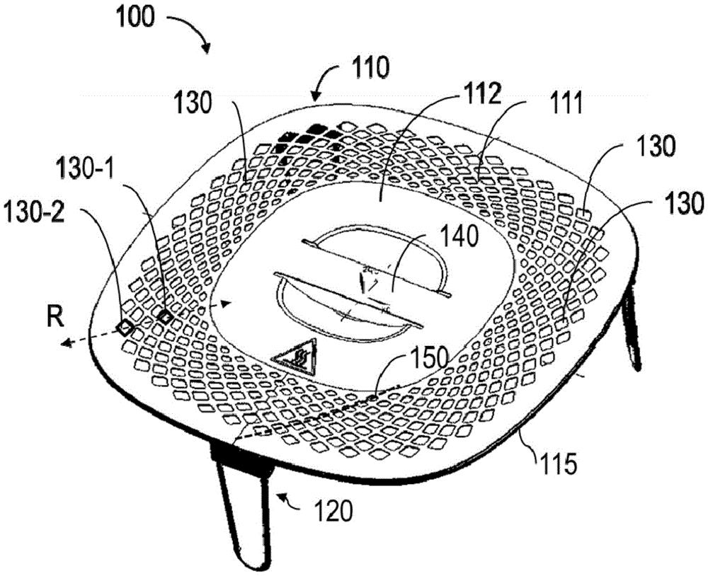 本公开的实施例涉及一种用于空气炸锅装置的盖子和一种包括该盖子的空气炸锅装置。盖子包括:顶部构件,其包括:穿孔的第一部分;基本上实心的第二部分,第二部分面向装置的加热元件;多个腿部,联接到顶部构件并能够延伸到装置的食物篮中以支撑顶部构件。