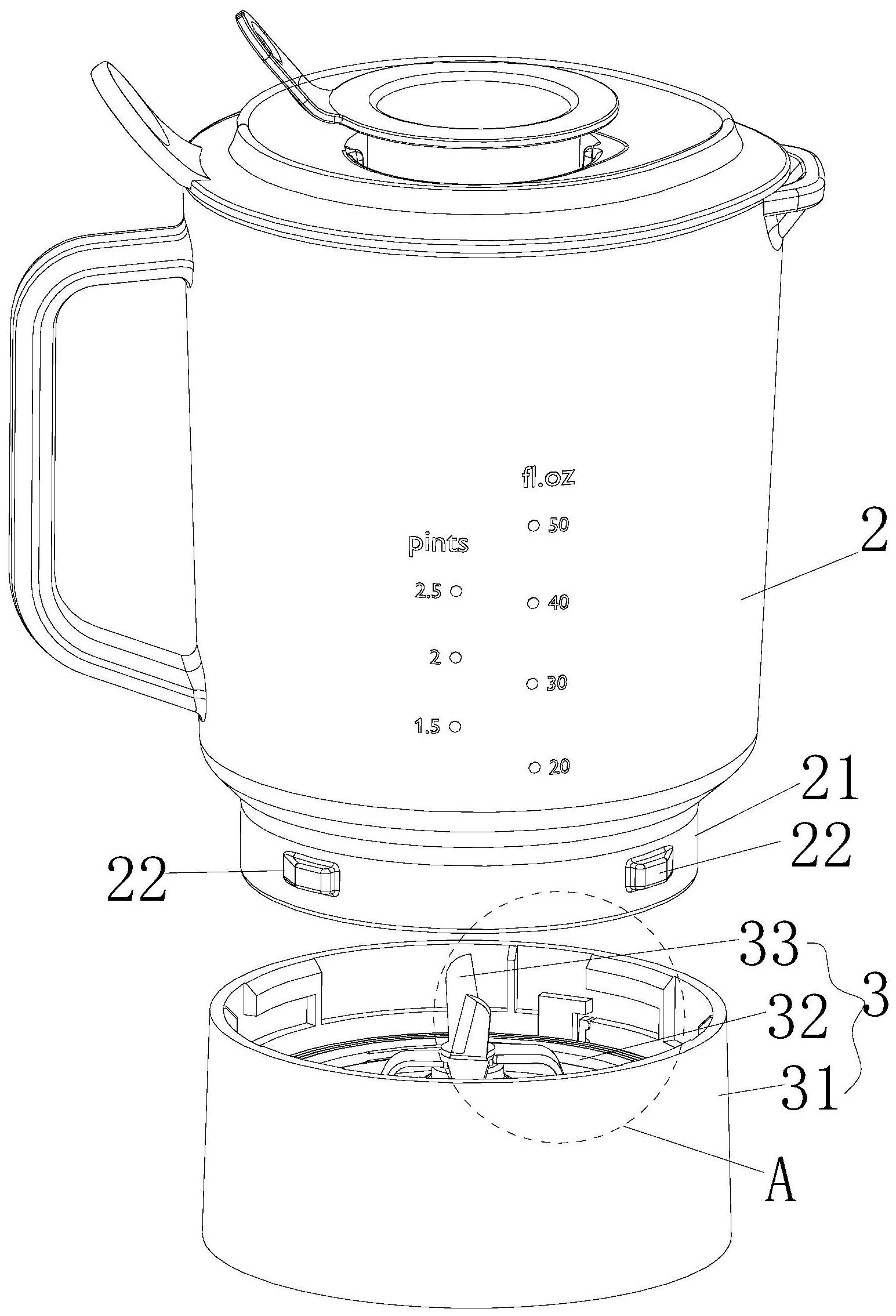 本发明公开一种搅拌容器及搅拌机。其中,搅拌容器包括容器本体和容器底座,容器本体的下端设有安装端部,容器底座包括连接套筒、底板和刀组,连接套筒与安装端部之间设有可拆卸安装结构;位于连接套筒与容器本体之间的滑动槽;能在滑动槽内上下滑动的止位栓,当安装端部与连接套筒之间通过可拆卸安装结构固定相连时,止位栓在滑动槽内处于第二相对位置以限制容器本体与连接套筒之间发生松脱或拆卸。本发明结构简单,避免了容器本体被误操作拆卸,从而提高整体可靠性及使用安全性。