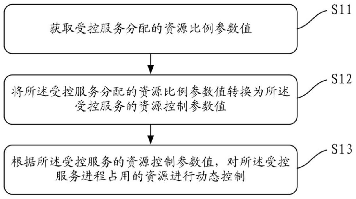 本发明公开一种资源控制方法、装置及设备、计算机可读存储介质,该方法包括步骤:获取受控服务分配的资源比例参数值;将所述受控服务分配的资源比例参数值转换为所述受控服务的资源控制参数值;根据所述受控服务的资源控制参数值,对所述受控服务进程占用的资源进行动态控制。本发明通过将受控服务分配的资源比例参数值转换为资源控制参数值,并对受控服务进程占用的资源进行动态控制;解决了多个分布式系统、非分布式系统在同一个集群运行时,存在的集群资源使用冲突的问题;防止受控服务对所有资源的独占导致其他系统运行被阻塞,提升了资源利用率。