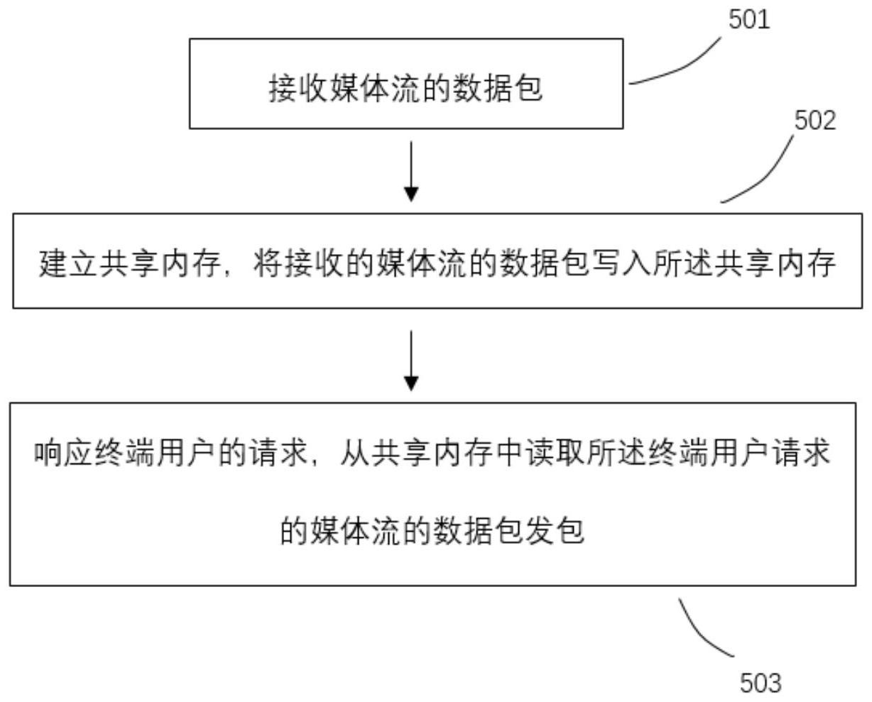 本发明公开了一种媒体流分发方法、CDN节点服务器、CDN系统和可读存储介质。其中所述媒体流分发方法包括:接收媒体流的数据包;将接收的媒体流的数据包写入共享内存;以及响应终端用户的请求,从共享内存中读取所述终端用户请求的媒体流的数据包发包。本发明提出的媒体流分发方法解决了在根据现有技术的媒体流分发过程中,存在大量的用户态到内核态缓存拷贝的技术问题,降低了系统的消耗,提升了设备的服务能力,进而减低了设备配置的成本。