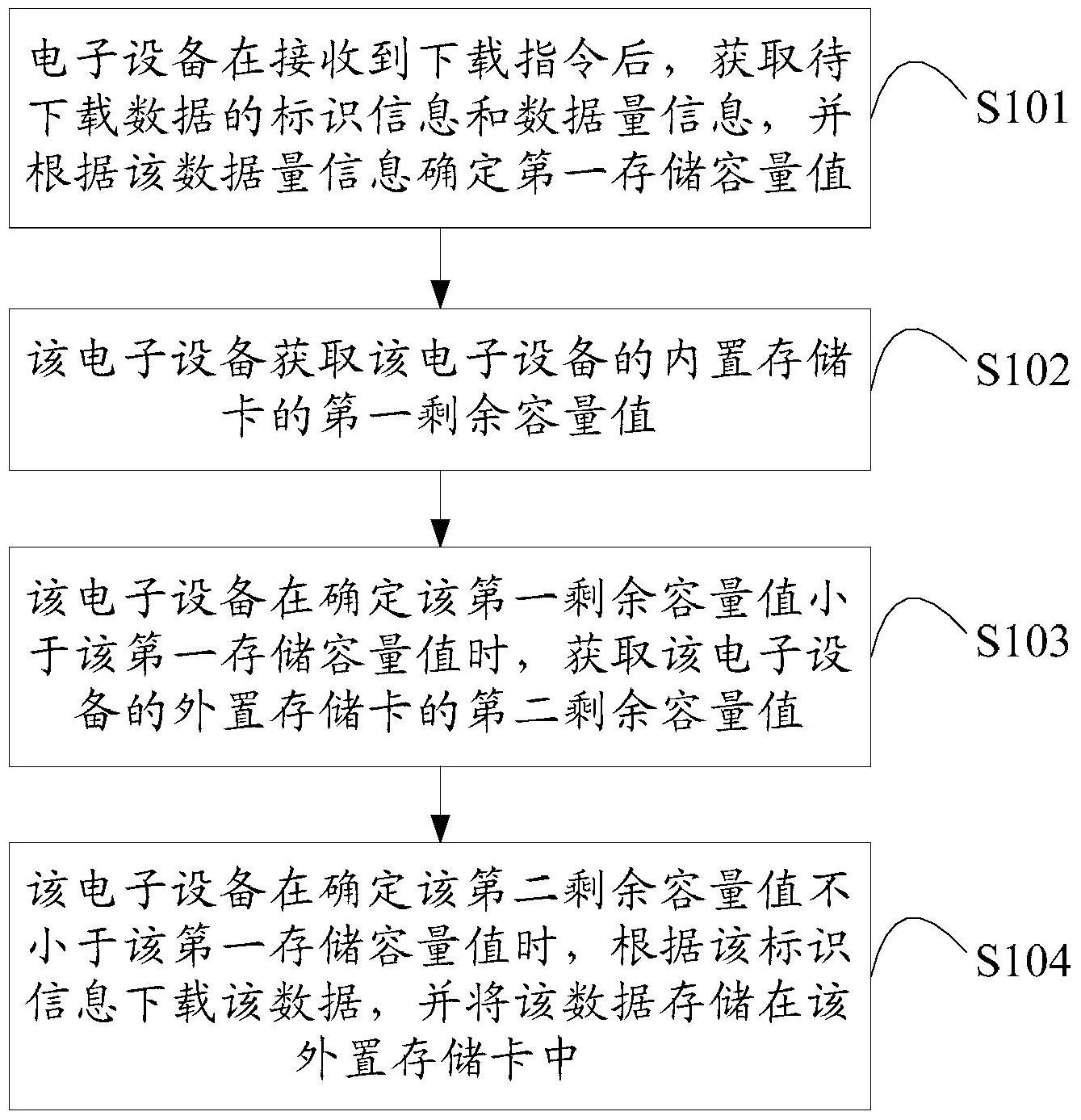 本发明实施例提供一种下载数据的方法和设备。涉及通信技术领域,能够在电子设备下载数据时,由内置存储卡切换为外置存储卡存储该数据,避免了因内置存储卡的剩余容量不足而导致的该数据无法下载。该方法包括:在接收到下载指令后,根据待下载数据的数据量信息确定第一存储容量值,并在确定该电子设备的内置存储卡的第一剩余容量值小于该第一存储容量值时,获取该电子设备的外置存储卡的第二剩余容量值,则该电子设备在确定该第二剩余容量值不小于该第一存储容量值时,根据待下载数据的标识信息下载该数据,并将下载到的该数据存储在该外置存储卡中。本发明实施例用于下载数据。