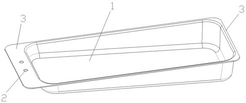 一种托盘,包括托盘本体,其特征在于:托盘本体的一侧高于与之相对的另一侧,较低侧边上外翻边沿的宽度大于其他侧边边沿的宽度。托盘可以在边沿位置安装品名及促销信息物件,可有效识别托盘内对应产品信息。托盘衔接陈列后呈现视觉统一倾斜角度。