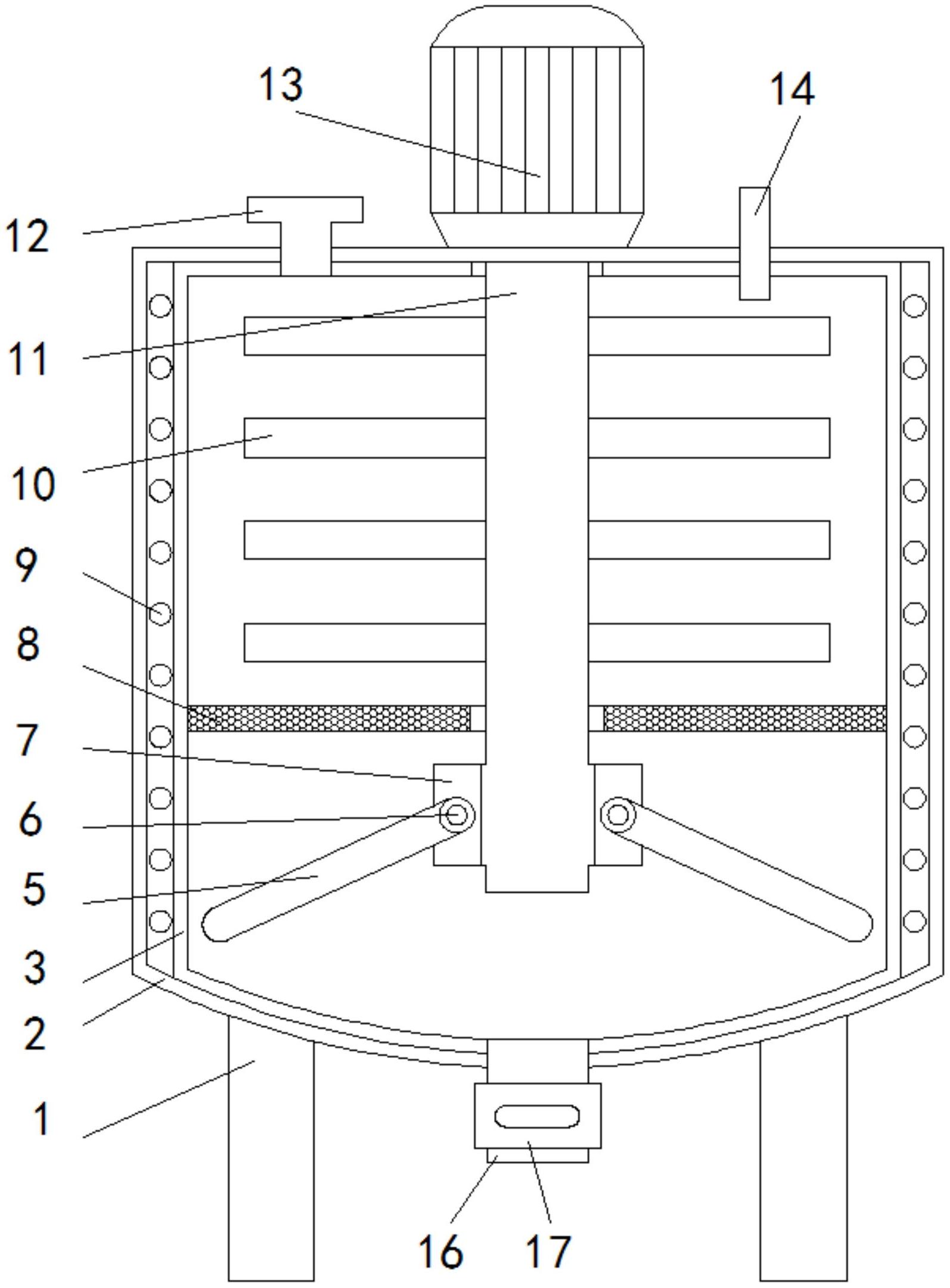 本实用新型涉及一种复合生物酶甲醛清除剂生产用反应釜,包括外箱体,所述外箱体的底部固定连接有支撑腿,所述外箱体的内部固定连接有内箱体,所述内箱体的顶部固定连接有入料口,所述内箱体的顶部固定连接有探温器,所述内箱体的内部活动连接有搅拌组件;所述搅拌组件包括电动机。该复合生物酶甲醛清除剂生产用反应釜,通过将物料从入料口倒入进内箱体,启动电动机并带动转动轴旋转,使转动轴连接的搅拌叶片不停的搅拌内箱体中的物料,同时电热管升温使内箱体内部的物料搅拌过程中得到充分的挥发,同时转动轴连接的转动块旋转,使搅拌软棒上下摆动,在旋转过程中搅拌角落的物料,避免有的物料出现没挥发的效果,搅拌完后通过出料管抽出即可。