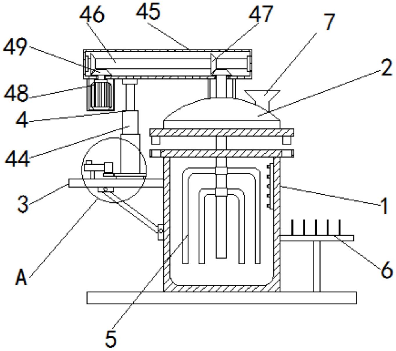 本实用新型涉及一种高效的甲醛清除剂生产用反应釜,包括罐体、罐盖、固定架和组件,所述罐体与罐盖外部均设置有旋转升降机构,电机a的输出轴处固定连接有齿轮a,所述固定架上表面活动安装有旋转齿轮,旋转齿轮的顶部固定连接有电动推杆,固定座内腔活动连接有活动杆,活动杆的外部固定连接有齿轮b,电机b的输出轴处固定连接有齿轮c。该高效的甲醛清除剂生产用反应釜,通过设置了旋转升降机构,使其工作人员通过驱动电动推杆,通过电动推杆推动固定座上升,同时也带动了罐盖与组件的上升到预定地点,通过驱动电机a,通过齿轮a与旋转齿轮啮合,使其电动推杆旋转,同步带动罐盖与组件旋转,通过分离组件与罐体,使其工作人员清理便捷。