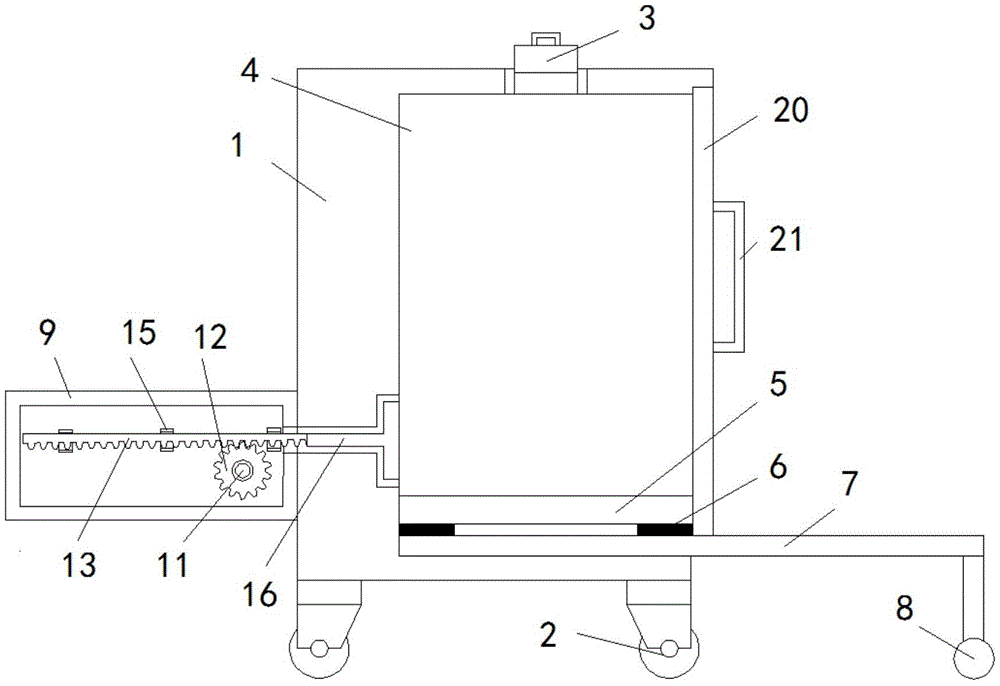 本实用新型涉及蒸汽清洗设备技术领域,且公开了一种蒸汽清洗装置设备,包括机体,所述机体底部的四角均固定连接有万向轮,所述机体的顶部活动连接有进料盖,所述机体的内腔活动连接有蒸汽筒,所述蒸汽筒底部固定连接有加热器,所述加热器底部的左右两侧均固定连接有滑块,所述滑块的底部滑动连接有一端贯穿并延伸至机体外部的滑板。该蒸汽清洗装置设备,通过进料口将液体灌入蒸汽筒的内部,再通过加热器对蒸汽筒的内部的液体进行加温,加温形成蒸汽之后,因为出水管与蒸汽筒是连通的,所以液体会流到出水管的内侧,再通过喷水枪喷出蒸汽与液体,对物体进行清洗,整体结构简单,方便使用,满足了实际使用的需求。