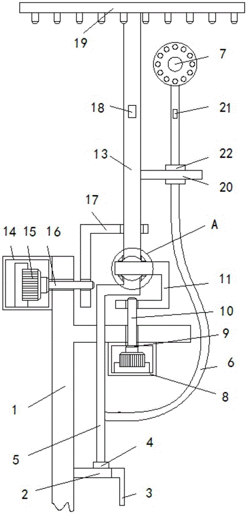 本实用新型涉及多功能清洗喷头技术领域,且公开了一种多功能按键清洗喷头,包括固定架,所述固定架的右侧固定连接有空心管,所述空心管的右侧活动连接有控制手柄,所述空心管的顶部连通有空心块,所述空心块的顶部连通有第一水管,所述第一水管的右侧连通有软管。该多功能按键清洗喷头,通过开启控制手柄将空心管内侧的水体放进第一水管当中,随后水体会流进空心滚珠,空心滚珠会将水体带进第二水管当中,通过开启淋浴按键,使得淋浴喷头喷水,实现了淋浴的目的,因为第一水管与软管是连通的,所以水体会流进软管当中,通过开启淋浴按键,使得洒水喷头喷水,实现了淋浴的目的,整体结构简单,方便使用,满足了实际使用的需求。