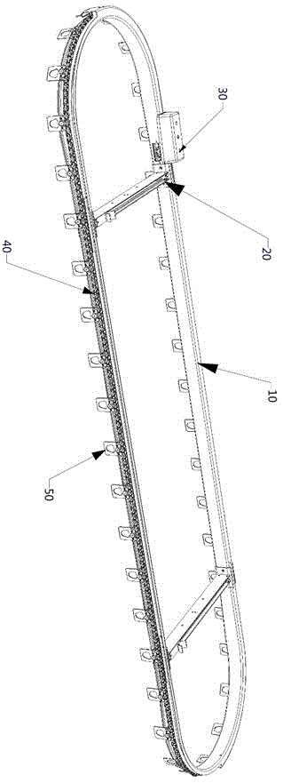 本实用新型公开了一种智能环形晾衣杆的旋转结构,包括环形晾架,所述环形晾架的内侧两端安装有托架,且托架的两端均与环形晾架相固定,所述环形晾架的顶端安装有电机,电机配合连接于传动装置输入端,所述环形晾架上设置有提供给传动装置滑动的上轨道,传动装置下端连接挂钩。此智能环形晾衣杆的旋转结构结构简单,环形晾衣杆通过电路板控制电机,电机拉动链条,链条带动挂钩,挂钩携带衣物沿轨道环形运动来达到环形晾衣功能的实现。
