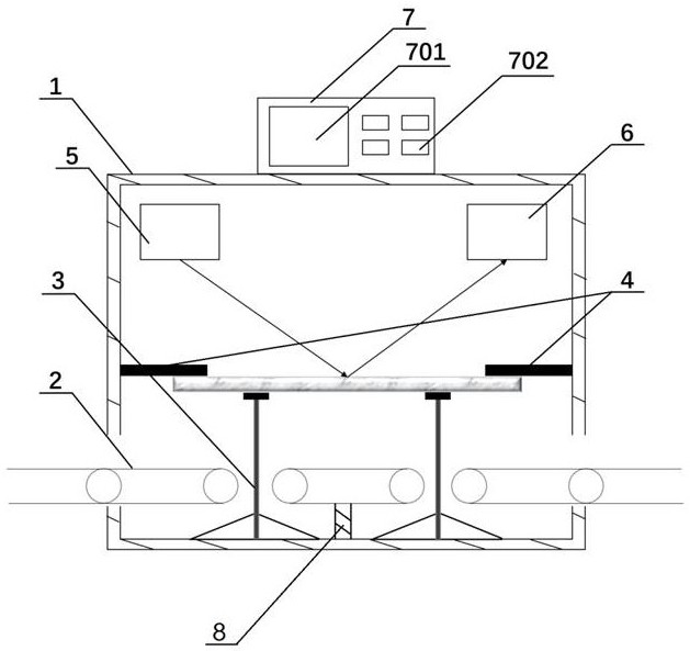 本实用新型涉及一种亮光面瓷砖镜面平整度的检测装置,包括壳体、支撑单元和图像检测单元;所述壳体的内部设有光源发生器、摄像设备和至少一对水平挡片,所述水平挡片分别对称设置在所述壳体的左右两侧且所述水平挡片的一端与所述壳体的内壁固定连接;所述支撑单元用于带动瓷砖移动至与所述水平挡片的下表面接触,并与所述壳体、所述水平挡片形成检测暗室;所述光源发生器与所述摄像设备位于所述水平挡片的上方,所述光源发生器发出的激光光源经所述瓷砖反射,被所述摄像设备获取并传送至所述图像检测单元。本实用新型通过设置不同类型的支撑单元,可以提高瓷砖检测的适配性,方便检测。