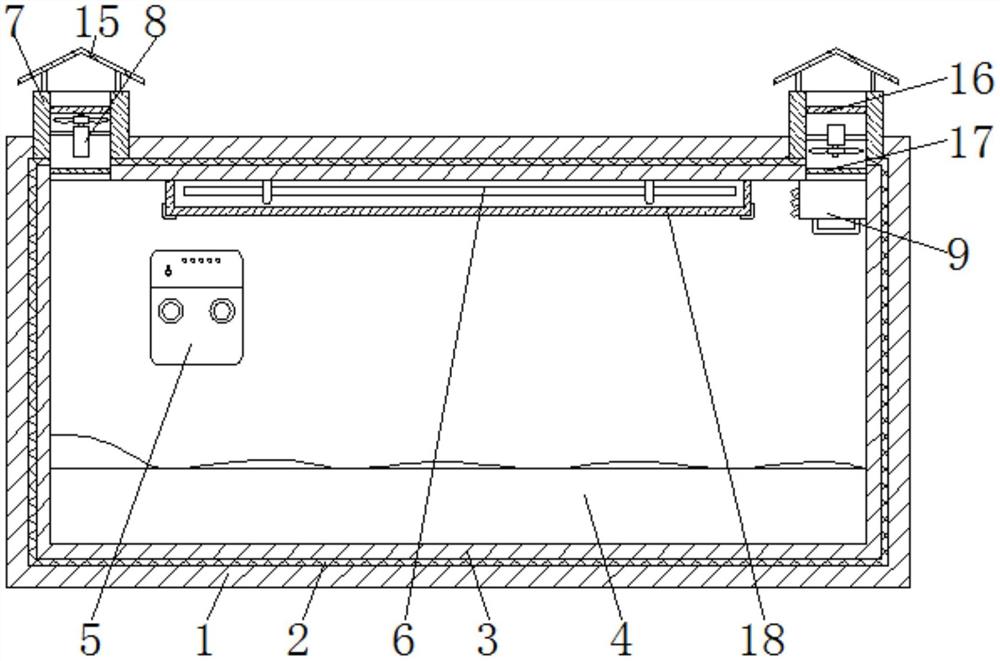 本实用新型公开了一种沉浸式减压及促眠舱,包括外舱体,所述外舱体的内壁固定连接有隔音层,所述隔音层的内壁固定连接有内舱体,所述内舱体内壁的底部固定连接有软床垫,内舱体内壁前侧与后侧的左侧均固定连接有立体环绕音响,内舱体内壁的顶部固定连接有环境氛围灯,外舱体顶部的两侧均连通有气管,气管的底部延伸至内舱体的内部,气管的内部均固定连接有风扇,内舱体内壁右侧的顶部固定连接有箱体。本实用新型具备了多方面促眠的优点,解决了传统的促眠舱以静音安静为主,在安静的环境中具有一定的促眠作用,由于使用人群的睡眠习性不同,因此起到的促眠效果降较低,容易造成降低使用者体验感的问题。