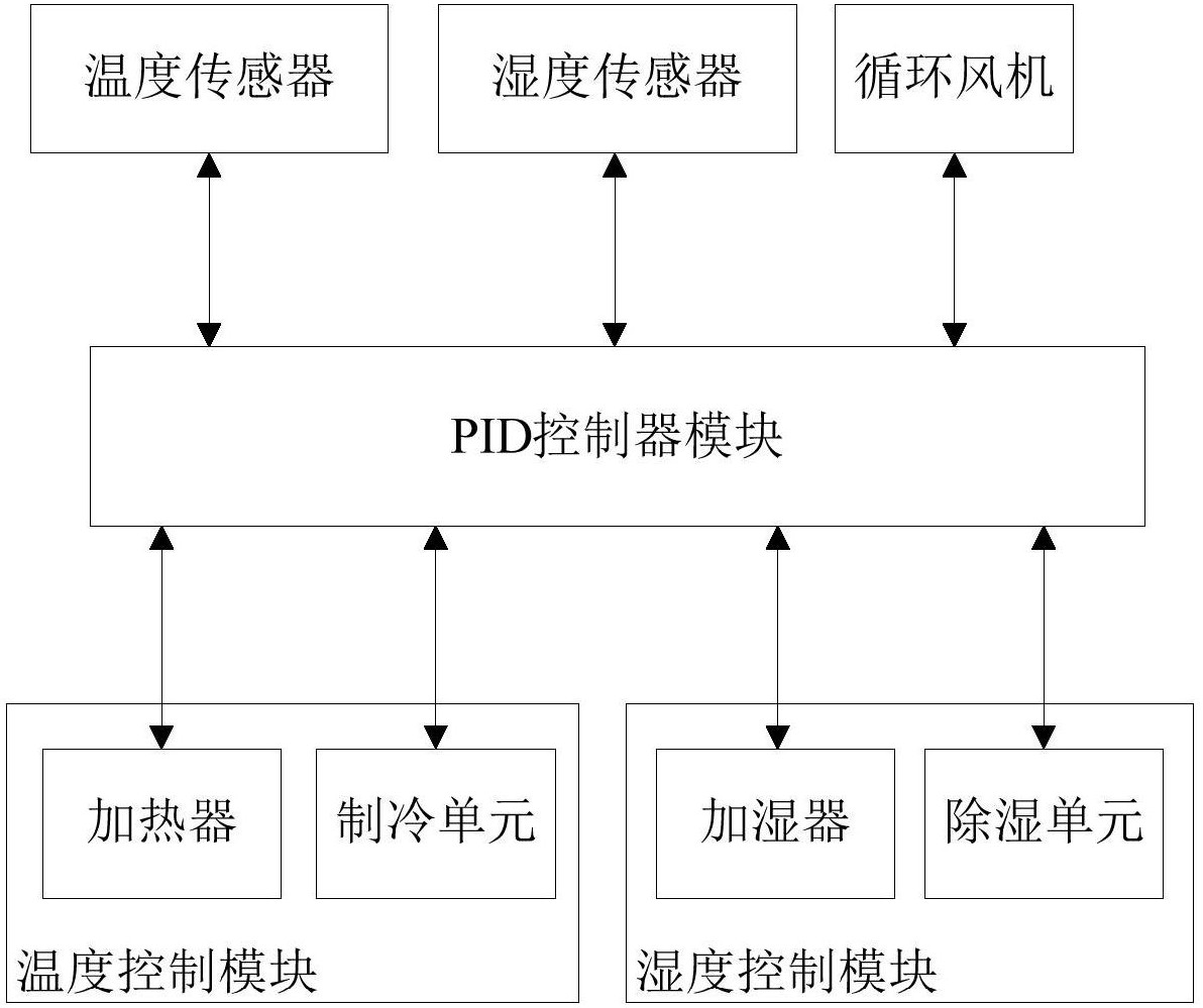 本实用新型公开了一种用于雪茄柜的温湿度控制系统,包括温度传感器、湿度传感器、PID控制器模块、温度控制模块、湿度控制模块和循环风机,所述温度控制模块包括加热器和制冷单元,所述湿度控制模块包括加湿器和除湿单元,所述PID控制器模块分别与温度传感器、湿度传感器、加热器、制冷单元、加湿器、除湿单元和循环风机连接;所述PID控制器模块用于根据预设温度差范围和温度传感器采集的信息控制加热器和制冷单元的工作状态,和用于根据预设湿度差范围和湿度传感器采集的信息控制加湿器和除湿单元的工作状态。本实用新型能够使柜内温湿度波动小,温湿度与设定值的偏差小,具有控温调湿精度高的效果,可广泛应用于温湿度控制领域。
