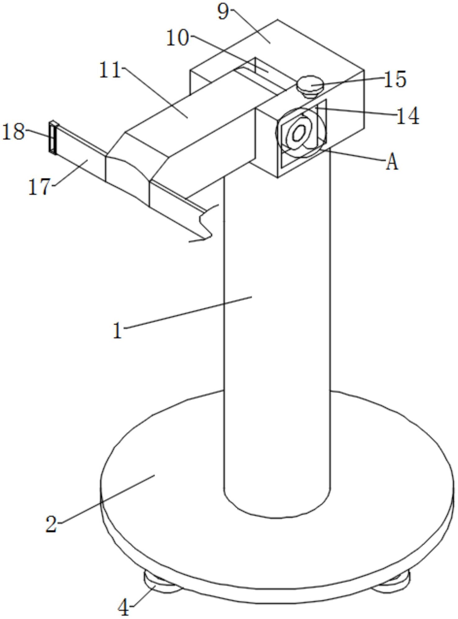 本实用新型提供一种便于调节的弧形腰测量器安装架,涉及安装架技术领域,包括圆杆,所述圆杆的底部固定有平衡板,所述平衡板的底部固定有四个支撑块,所述圆杆的底部中心处开设有第一圆槽,所述圆杆的顶部中心处开设有第二圆槽,所述第一圆槽的内部固定有电动推杆,所述第二圆槽的内部滑动有支撑杆,所述电动推杆的顶部输出端与支撑杆的底部固定连接,所述支撑杆的顶部固定有固定块。本实用新型中,通过安装架内部的电动推杆,可以调节安装架的高度的效果,再通过转动转动盘间接调节连接板的角度的效果,在使用时让设备的运行效果及检测状态都有有效的保障,对工作人员的工作状态及身材都有更有效的贴合效果。
