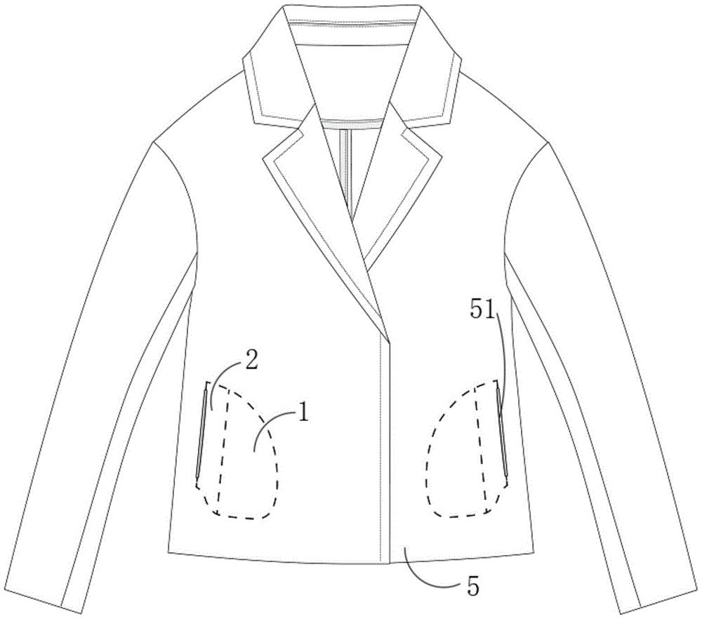 本实用新型涉及服装领域,尤其涉及一种挖袋及服装,包括第一袋布和第二袋布,第一袋布用于对折缝合形成袋体,第一袋布上开设有第一开口;第二袋布的面积小于第一袋布的面积,第二袋布缝合连接于第一袋布,且第二袋布对应第一开口的位置开设有第二开口,第二开口与第一开口连通以形成袋口,袋体可相对袋口在第一状态和第二状态之间翻折转换;其中,第一状态为袋体未相对袋口发生翻折的状态,第二状态为将第一状态下的袋体由内至外翻折后的状态。该挖袋能够节约布料,降低面料成本,提高经济效益,也不会增加衣服厚度,适用范围广。