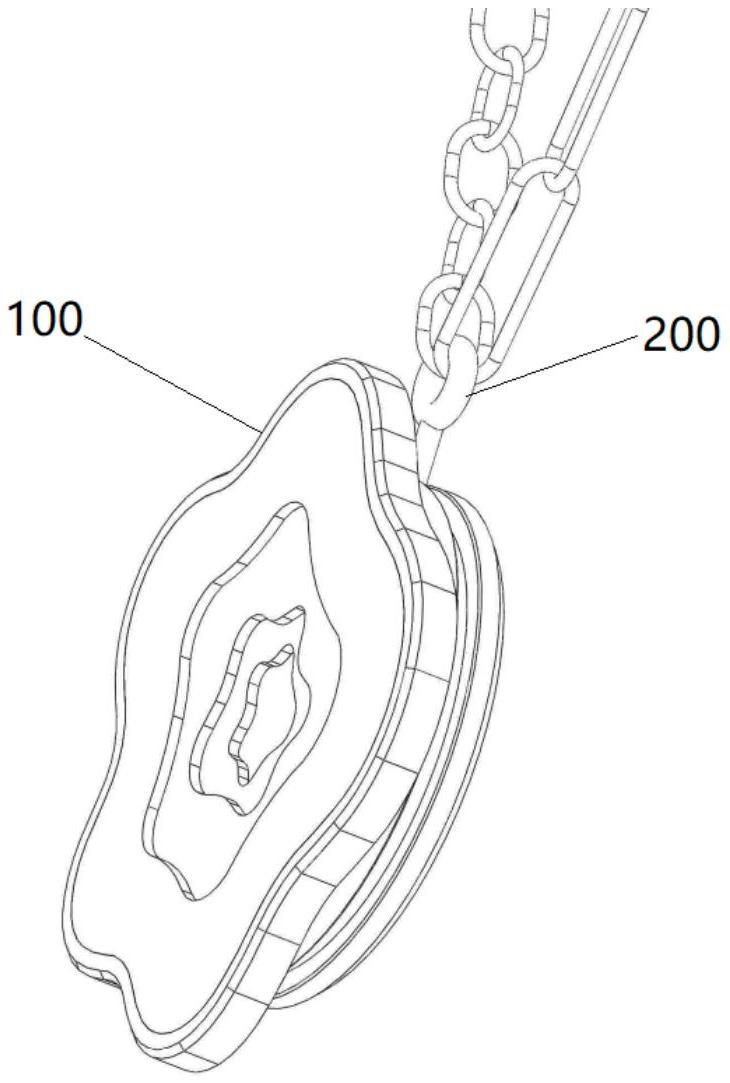 本实用新型提供了一种可变换表面造型的配饰,配饰本体包括自上而下依次排布的第一装饰片、主体框架、第二装饰片、第一旋转驱动部、第三装饰片、第四装饰片、支撑件和第二旋转驱动部;第一装饰片固定在主体框架上,第二装饰片固定在第一旋转驱动部上,第三装饰片固定在第二旋转驱动部上,第四装饰片固定在所述支撑件上,支撑环位于第二旋转驱动部的凹槽内;第一装饰片、第二装饰片和第三装饰片的中部镂空,第一旋转驱动部与主体框架之间转动连接,第二旋转驱动部与第一旋转驱动部之间转动连接。该实用新型可呈现出数百种乃至千余种不同的图形变化,方便佩戴者随时随地改变配饰的视觉效果。