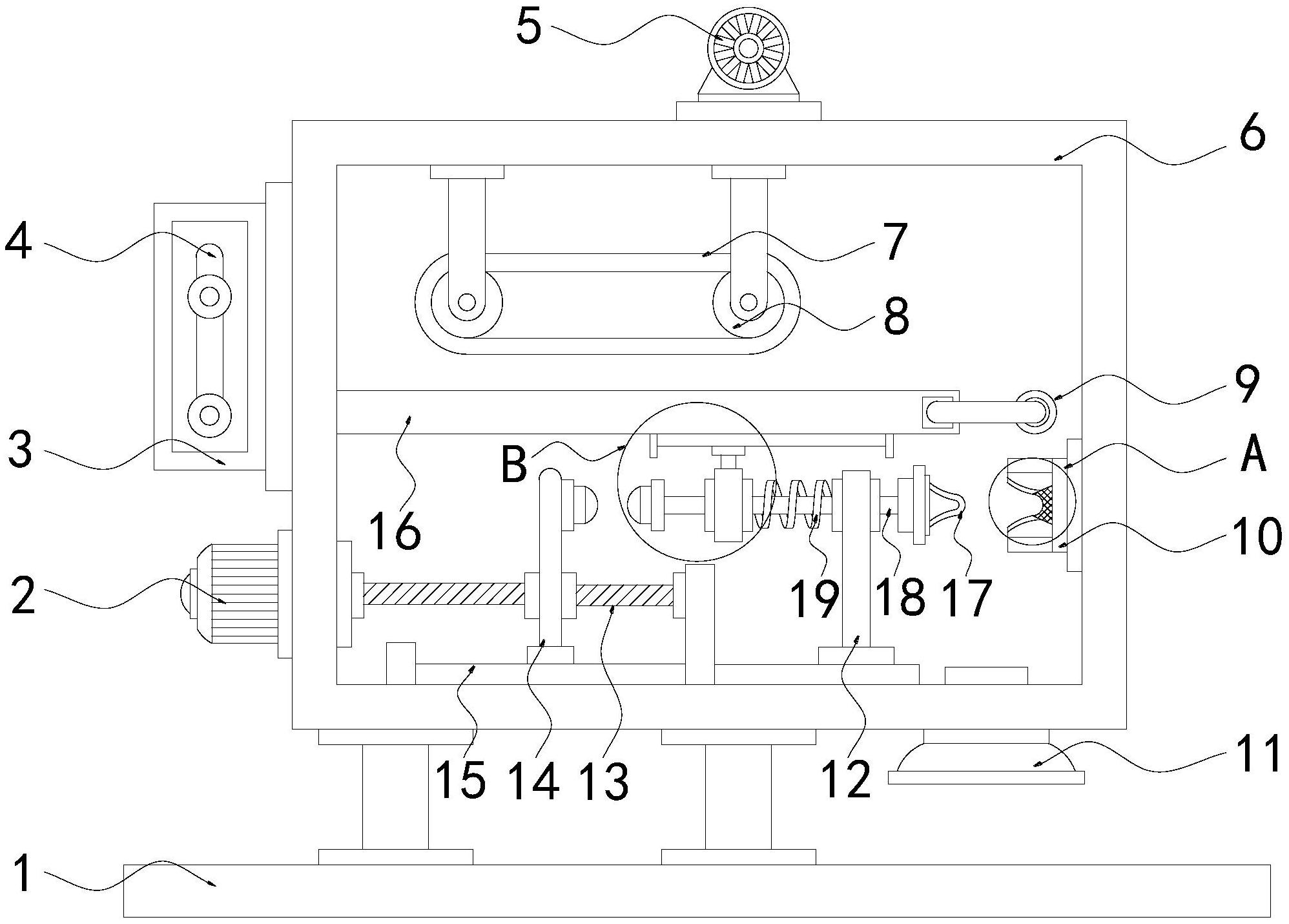 本实用新型属于纺织面料领域,具体为一种纺织面料生产用裁剪装置,包括装置底板,所述装置底板的上方通过固定架固定连接有装置外框体,所述装置外框体的底面设置有排料口,所述装置外框体的外壁固定安装有入料框,所述装置外框体的顶部设置有马达,所述装置外框体的内侧固定安装有隔板,所述装置外框体的内侧设置有两个输送辊。该纺织面料生产用裁剪装置,通过装置外框体内侧输送辊和皮带的设置,能够对入料框输入的原料提供动力驱动,配合上其底部隔板的设置,能够将原料输送到隔板和限位辊之间,达到对原料进行连续裁切的效果,避免现有装置在对原料进行裁切时不能连续工作而导致工作效率较低且工作人员工作量较大的情况出现。