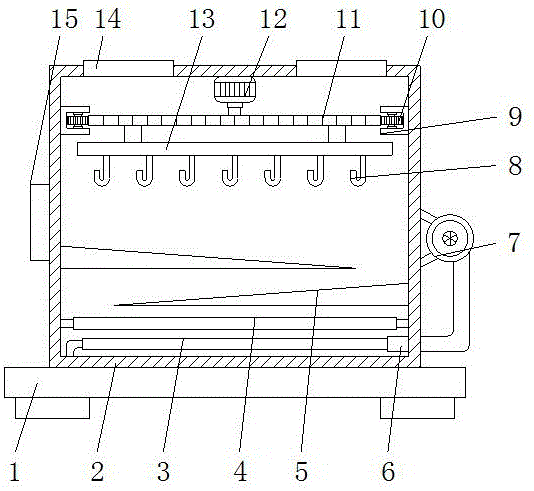 本实用新型公开了一种服装生产用烘干装置,包括底板,底板的顶部固定连接有箱体,箱体内腔的顶部固定安装有电机,电机的输出轴传动连接有主动齿轮,主动齿轮的两侧啮合连接有从动齿轮,从动齿轮的内表面通过传动杆传动连接有防护板,主动齿轮的底部固定连接有挂板。本实用新型通过电机的输出轴传动连接有主动齿轮,主动齿轮的两侧啮合连接有从动齿轮,从动齿轮的内表面通过传动杆传动连接有防护板,主动齿轮的底部固定连接有挂板,挂板的底部固定连接有挂钩,起到了均匀烘干的效果,解决了现有的烘干装置存在不具备均匀烘干的功能,从而不能有效的针对不同部位的服装进行生产,从而降低了服装生产效率的问题。