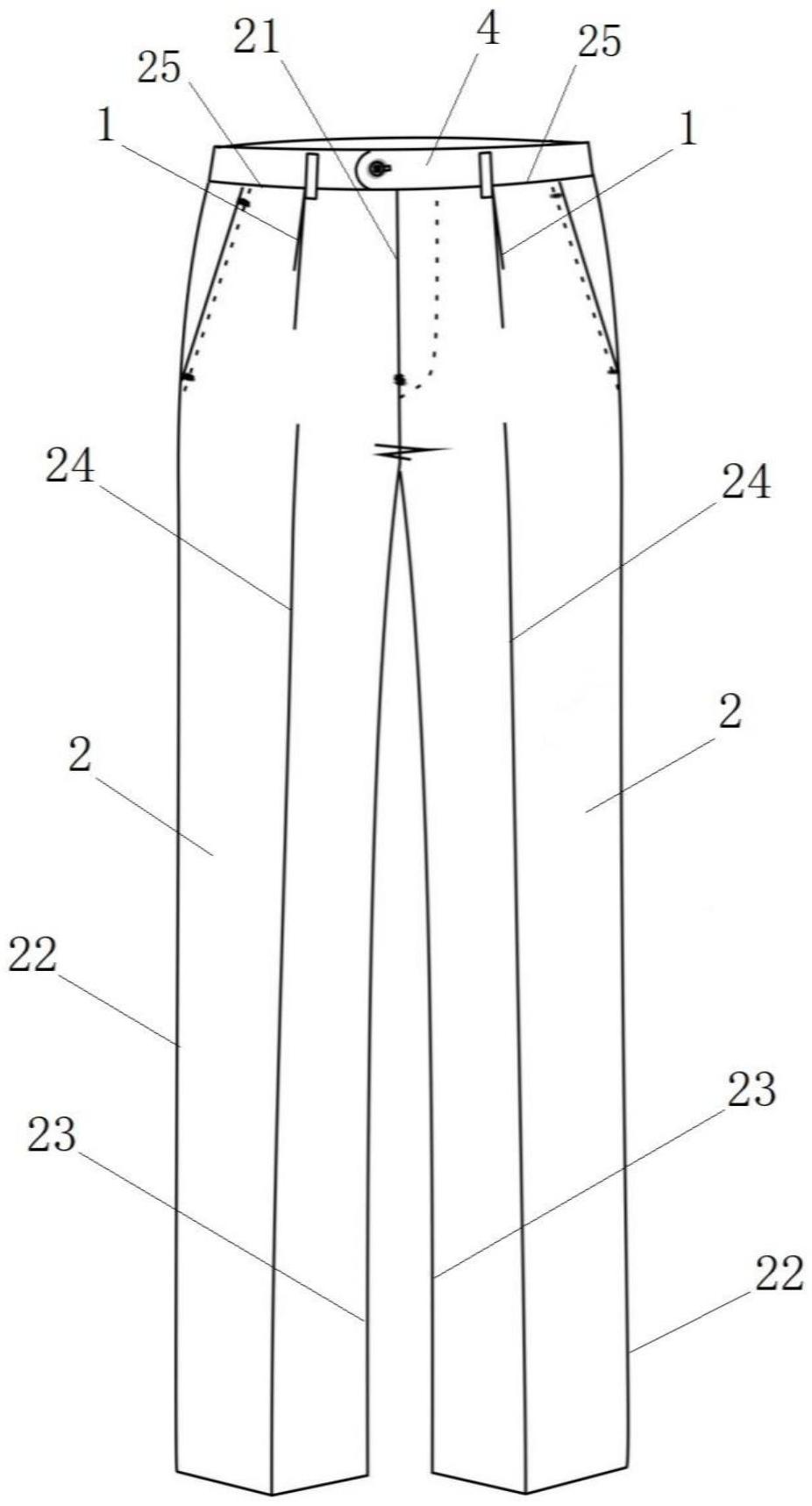本实用新型公开了一种西裤,包括前片;前片设有第一褶;第一褶的第一边界点位于前片的腰头位置处的前挺缝线与前襟之间,且与前挺缝线相距第一距离;第一褶的第二边界点位于前片的腰头位置的前挺缝线与前侧缝之间,且与第一边界点相距第二距离;第一褶的省尖点位于前挺缝线上且位于前片的腰头位置向下偏移第三距离的位置处;通过在前片设置第一褶,利用第一褶的第一边界点、第二边界点和省尖点限定第一褶的第一标记线、第二标记线、第一折叠位置、第二折叠位置和第一缝合位置,形成的第一褶能够位于前片的腰头位置与臀围线位置之间,从而达到既能适应不同人群的大腿围度和臀围,达到提升裤子的简洁感的技术效果。