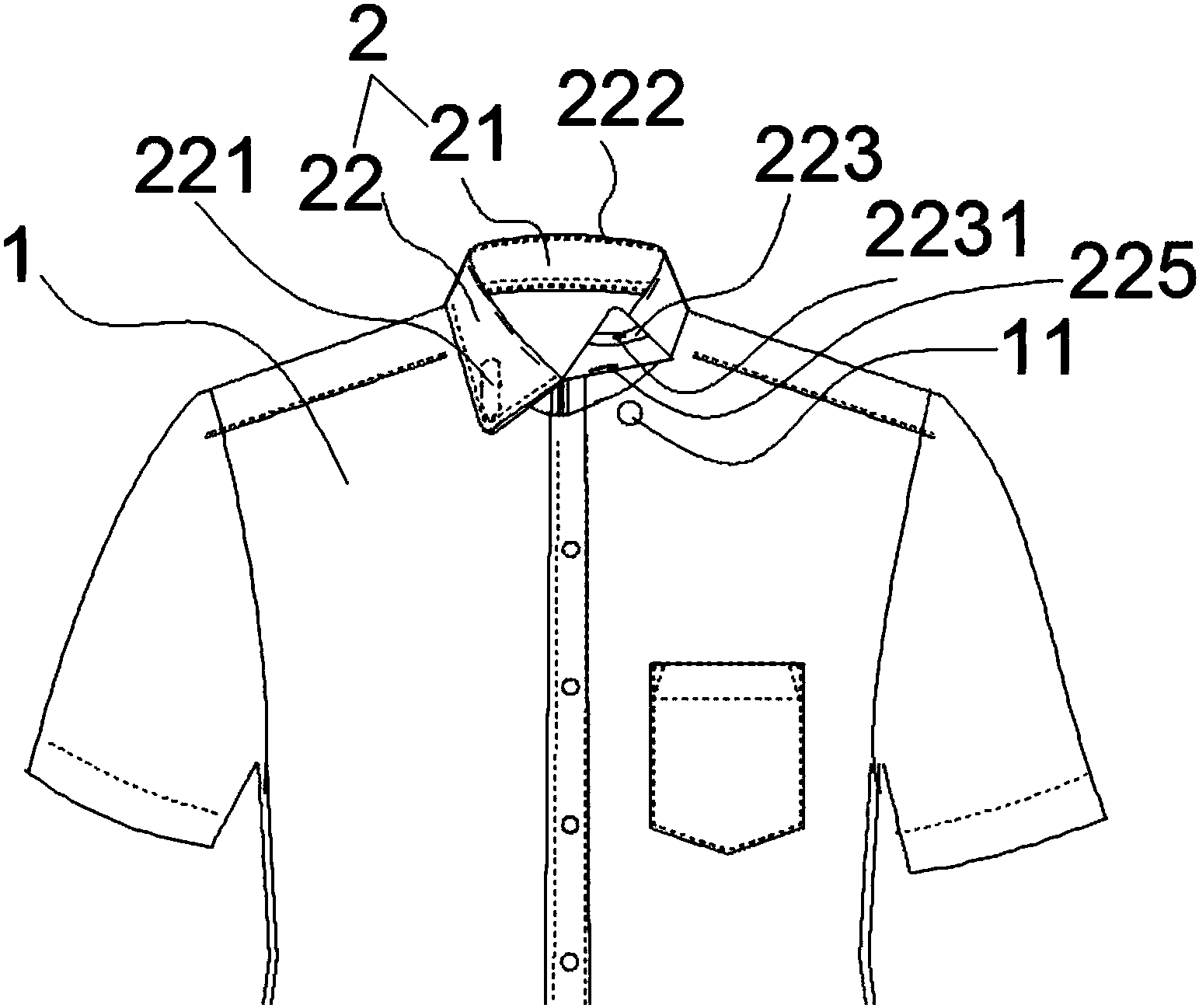 本实用新型公开了领部定形的衬衫。该领部定形的衬衫包括包括衬衫衣身,衬衫衣身的领口处设有领部,领部上设有领部包括第一领部和第二领部,第二领部能够沿着第一领部的上边缘进行翻折,第二领部上设有领尖,领尖的内部设有定型片,定型片为塑料片,定型片位于领角的角平分线上,定型片靠近领尖边的一端形状与领尖形状相配合一致;第二领部与第一领部连接处设有预缩部,预缩部能够将第二领部预缩定位至能够配合第一领部与领口相连接在一起所弯曲的位置。本实用新型具有使得衬衫领部平整贴合、不变形、不起皱和不卷翘的效果。