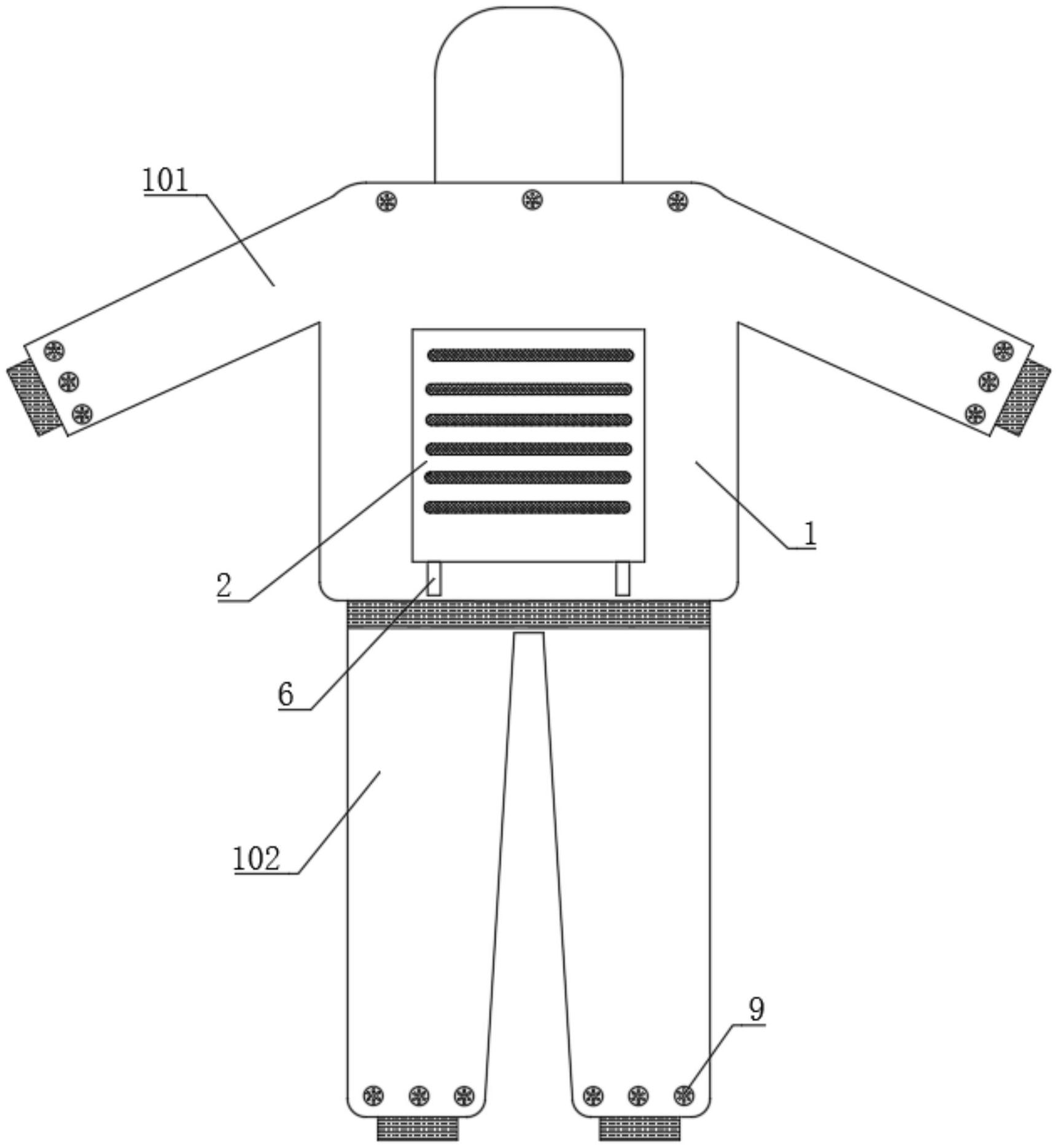 本实用新型涉及防护服技术领域,具体为一种具备可开合通气结构的抗静电防护服,包括防护服主体,所述防护服主体的一侧固定连接有安装盒,所述安装盒的内部设置有第一风扇和第二风扇,所述安装盒靠近第一风扇和第二风扇的一侧均开设有透气孔,所述安装盒靠近第二风扇的一侧固定连接有固定壳,所述固定壳的一侧固定连接有气管。本实用新型的优点在于:通过设置第一风扇,达到了可以通过气流在防护服主体内部进行循环,从而有效的对防护服主体和衣袖进行通气降温,通过设置第二风扇、固定壳和气管,达到了可以通过气流在裤腿内部进行循环,从而有效的对裤腿进行通气降温,通过设置挡板和过滤板,达到了可以对进入安装盒的气流进行过滤。