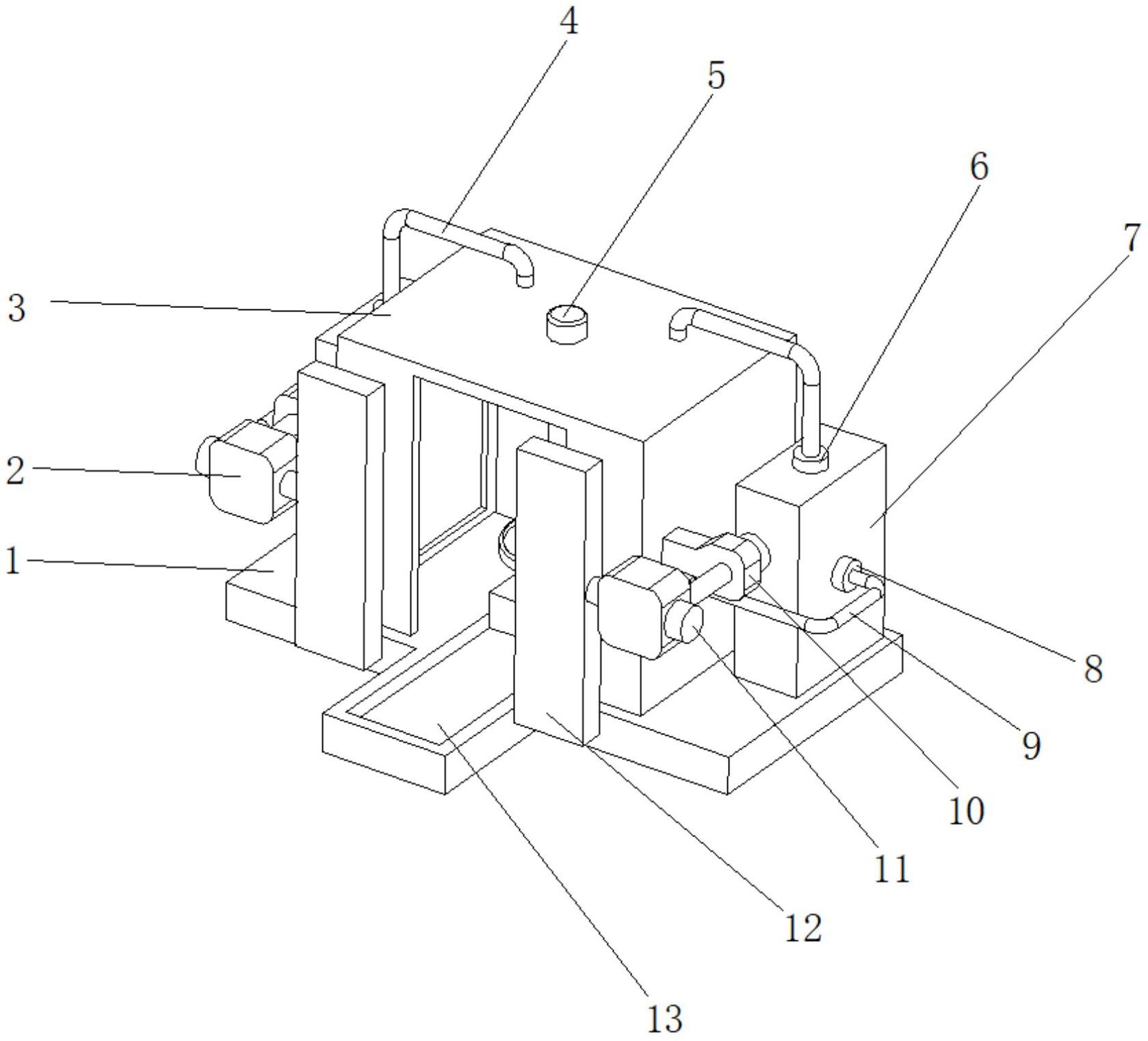 本实用新型属于防护服技术领域,尤其为一种防护服生产用的面料干燥装置,包括工作板,所述工作板的上表面设置有干燥箱,所述干燥箱的侧表面设置有加热箱,所述加热箱的上表面设置有第一干燥机构,所述加热箱的侧表面设置有第二干燥机构,所述加热箱的内部设置有电热管,所述加热箱的一侧设置有工作架。在需要对布料卷进行干燥处理时,可以使用第一引风机抽取加热箱内部的热风经过第一热气管道输送到第二热风板内,然后通过第二引风机抽取加热箱内部的热风经过第二热气管道输送到第一热风板内,从而通过第一热风板、第二热风板将热风从而布料卷的上方与两侧喷出,从而对布料进行较为全面的烘干。