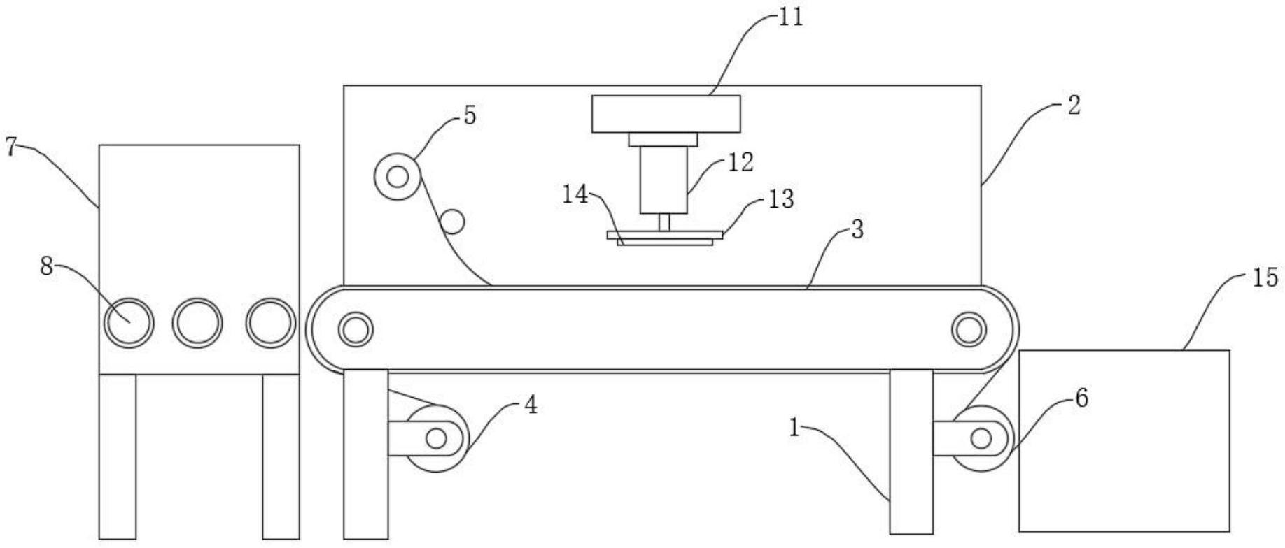 本实用新型公开了一种羽绒服快速装袋装置,包括支腿和机架,传送带的一侧设置有输送箱,输送箱的内部安装输送机构,输送机构包括第一微型电机、第一滚筒、第二微型电机和第二滚筒,第一微型电机和第二微型电机分别安装于输送箱的两侧外壁上,第一微型电机和第二微型电机的输出轴分别与第一滚筒和第二滚筒固定连接,通过在传送带的一侧设置有输送箱,且输送箱的内部设置输送机构,通过对第一微型电机和第二微型电机进行相反方向驱动,可对折叠好的羽绒服进行按压成型并对其进行输送进行装袋处理,有效的避免了折叠好的羽绒服在装袋处理时发生松散膨胀。