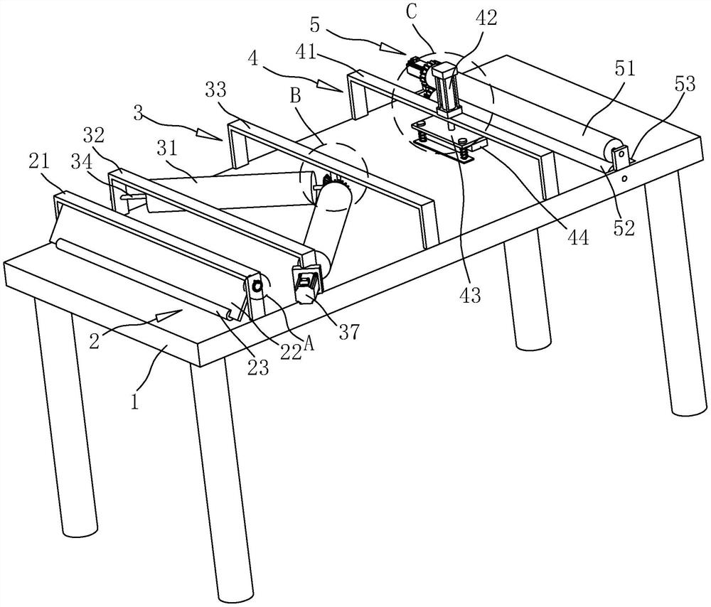 本申请公开了一种用于布料裁切加工的工作台,其包括工作台本体,工作台本体上设置有抚平组件、冲裁组件以及进料组件,抚平组件包括设置于工作台本体上方的抚平板,抚平板的底端朝向布料的进料方向倾斜设置,抚平板的底边与工作台本体贴合设置,冲裁组件包括设置于工作台本体上的刀模以及驱动刀模沿竖直方向移动的第一驱动件,进料组件包括转动设置于工作台本体上的第一进料辊与第二进料辊,第一进料辊与第二进料辊贴合设置,工作台本体上设置有驱动第一进料辊与第二进料辊沿相反方向转动的第二驱动件。本申请具有提高布料冲裁的效率与质量的效果。