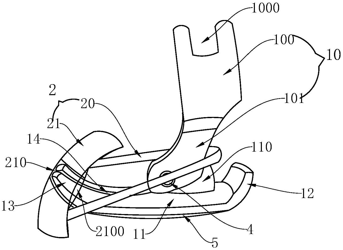 本实用新型涉及服装生产设备技术领域,尤其涉及一种棉绒衣料缝制用的压脚装置,包括压脚和与压脚配合使用的防刮部件,压脚包括连接柄,连接柄的下方设有与连接柄相连接的压板,压板的一端设有第一翘起部,压板的另一端设有一对长度相同的第二翘起部,压板靠近第二翘起部的一侧设有供辑线针活动的长方形辑针通道;防刮部件包括固定件以及与固定件相连接的防刮件,防刮件的中间设有与第二翘起部相互适配的收纳区。采用上述压脚装置有效解决了缝制棉绒衣料所出现棉绒衣料被压脚刮起来的问题,大大提高了工作效率和缝制质量。