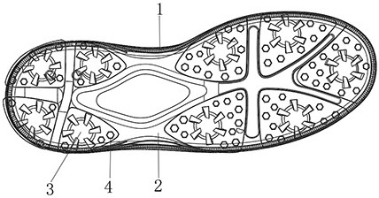 本实用新型公开了一种用新型鞋钉底型制作的高尔夫鞋,包括鞋面和鞋底,所述鞋底包括上鞋底和下鞋底,所述下鞋底的底部安装有钉爪,所述钉爪的外部均安装有套壳,所述套壳嵌入在所述下鞋底的底部,所述下鞋底的底部还均匀的设置有多组凸起;本实用新型中,本方案是利用新型双层套模的工艺将原有高尔夫鞋子鞋钉的效果保留,但是去掉其锋利的周边棱角,用比较缓和的方式,采用新型双层套模的工艺,将原有的钉爪用套壳的方式装在套壳里面,这样外表的钉爪整体既有原有钉爪的高度和形状,但是又具有足球鞋的柔和的表面效果,这样既能够保证高尔夫运动员的站立稳定,又能保证球场草地和草坪不会损害和损伤,有利于草地的长期使用。