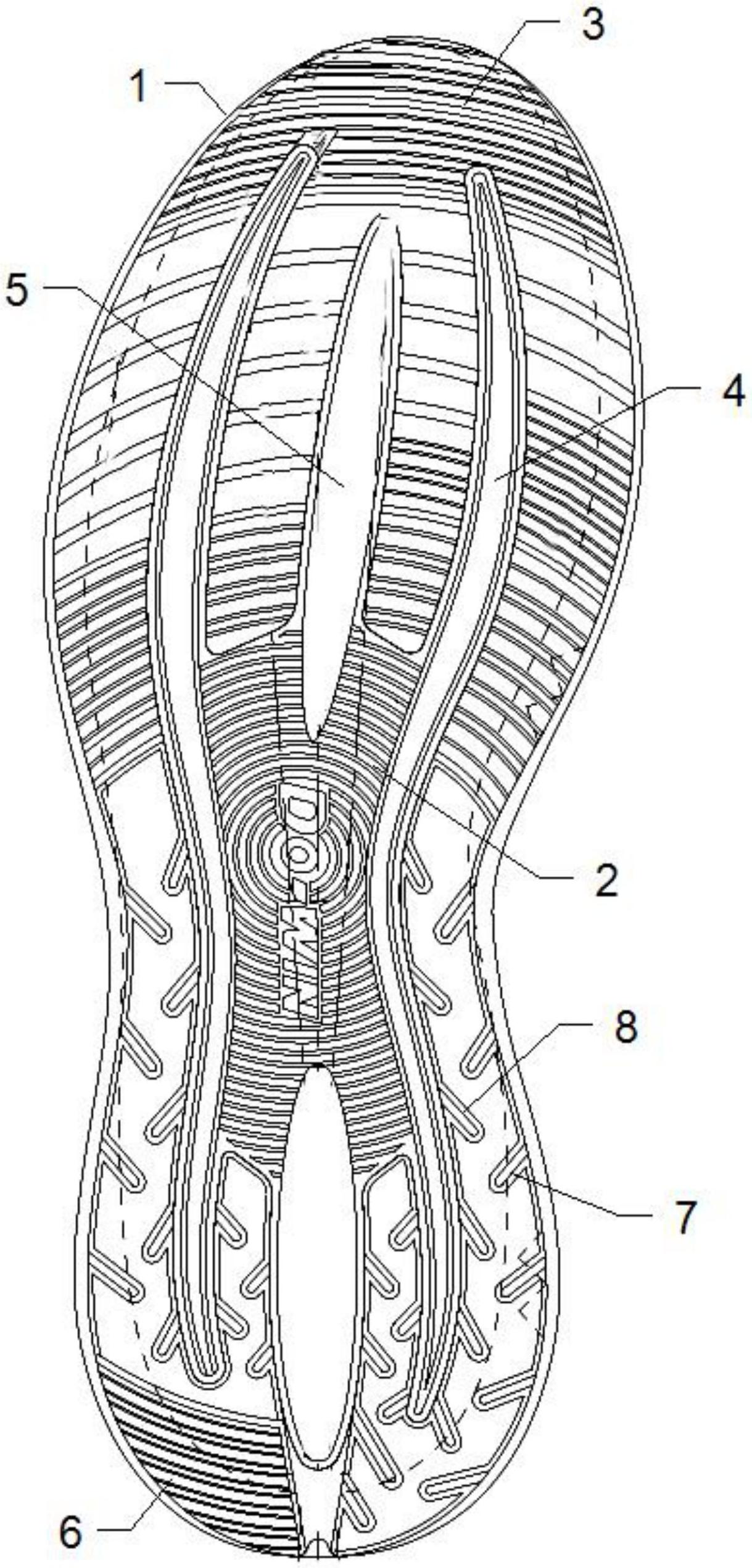 本实用新型公开了稳定路跑鞋,属于动运鞋技术领域,包括鞋底和单层贾卡鞋面,所述单层贾卡鞋面与鞋底固定连接,所述鞋底的头部最大宽度是跟部最大宽度的1.25倍,所述鞋底的跟部下端开设有第一U形纹和第二U形纹,所述第一U形纹和第二U形纹呈倒八字分布,所述鞋底的中部下端开设有第一收胀槽和第二收胀槽,所述第一收胀槽和第二收胀槽均设有一对,使第一U形纹和第二U形纹外侧部分避开沙粒,提高了抗沙粒或积水防滑的能力,鞋底前部与地面接触后,利用第一收胀槽、第二收胀槽受压膨胀和弧形纹弯曲增加第一收胀槽和第二收胀槽膨胀范围,使鞋底前部在抓地的瞬间增加抓地范围提高稳定性,从而提高了实用性。