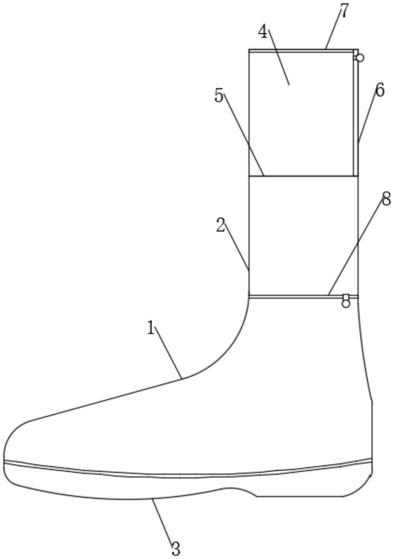 本实用新型公开了一种牛皮革制面带有活动折角的工作靴,属于工作靴领域,包括鞋体、一体连接在鞋体顶部的鞋筒以及一体连接在鞋体底部的鞋底,所述鞋筒的顶部连接有可翻折的活动折角,所述鞋筒与活动折角之间设有翻折线,所述活动折角的一侧设有用于闭合活动折角的第一拉链,所述活动折角上端的边沿处设有第二拉链,所述鞋筒表面位于翻折线的下方设有与第二拉链相适配的第三拉链;通过活动折角、翻折线、第一拉链、第二拉链和第三拉链的设置,可同时兼具长筒和短筒的优势,在长筒和短筒之间自由切换,避免选择困难,更好的满足使用需求。