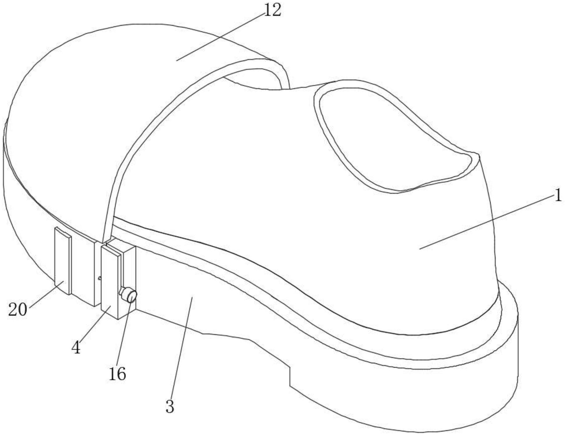 本实用新型涉及劳动保护用品技术领域,且公开了一种前置防砸包头的劳保鞋,鞋身和鞋底,所述鞋身固定连接在鞋底的顶部,所述鞋底的表面固定连接有加厚层,所述加厚层的两侧均固定连接有固定块,所述固定块顶部开设有滑槽,所述滑槽的正面开设有定位槽,定位槽的内壁卡接有定位机构,鞋底的表面开设有卡槽,加厚层的表面开设有通槽。该前置防砸包头的劳保鞋,通过设置防护套、包头和减震垫,通过在鞋身的前端增加可替换的防护套和包头,对鞋身的前端进行保护,当包头的防砸效果降低时,可替换新的包头,包头在受到撞击后,包头内部的减震垫可吸收撞击力,减少传递至鞋体的震动,提升防砸效果,达到了提升鞋子防护性能的效果。