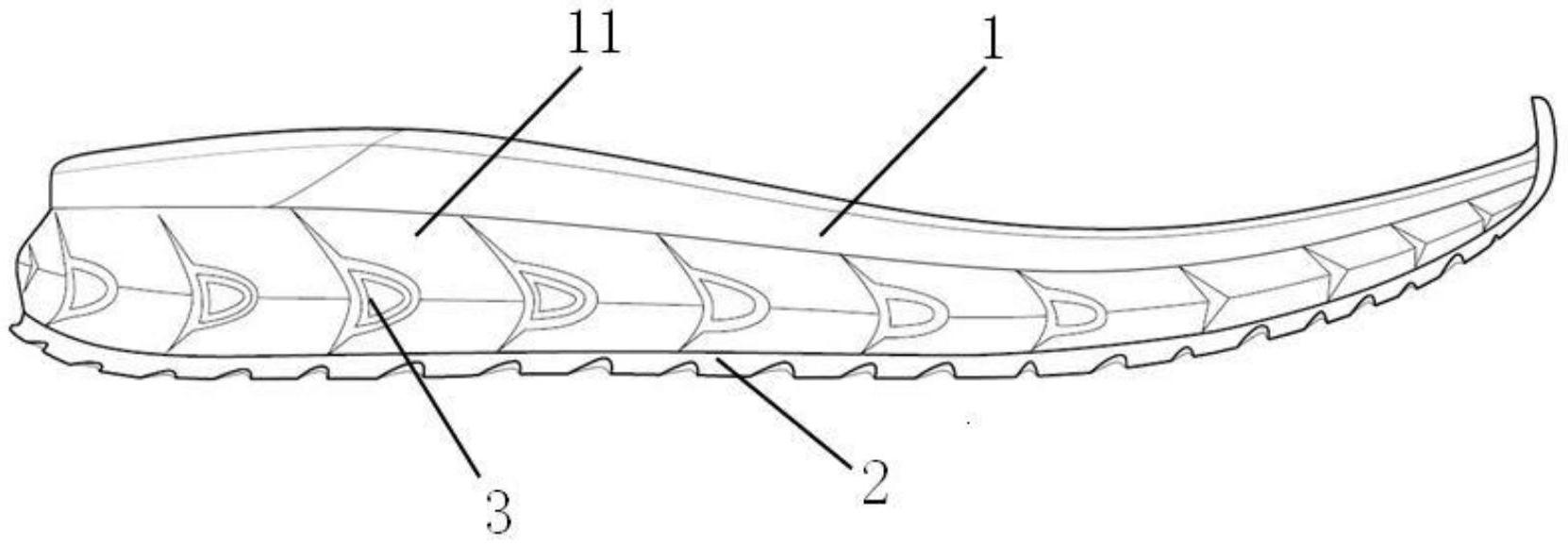 本实用新型公开了一种减震鞋底,其属于鞋子技术领域,包括减震层和防滑层,沿所述减震层的长度方向间隔设置有多个呈月牙形的减震孔,所述减震孔由所述减震层的后方向前方凸起,所述减震孔贯穿于所述减震层的宽度方向;所述防滑层固定连接于所述减震层的下端。本实用新型提出的减震鞋底减震效果好,舒适性好,重量小。
