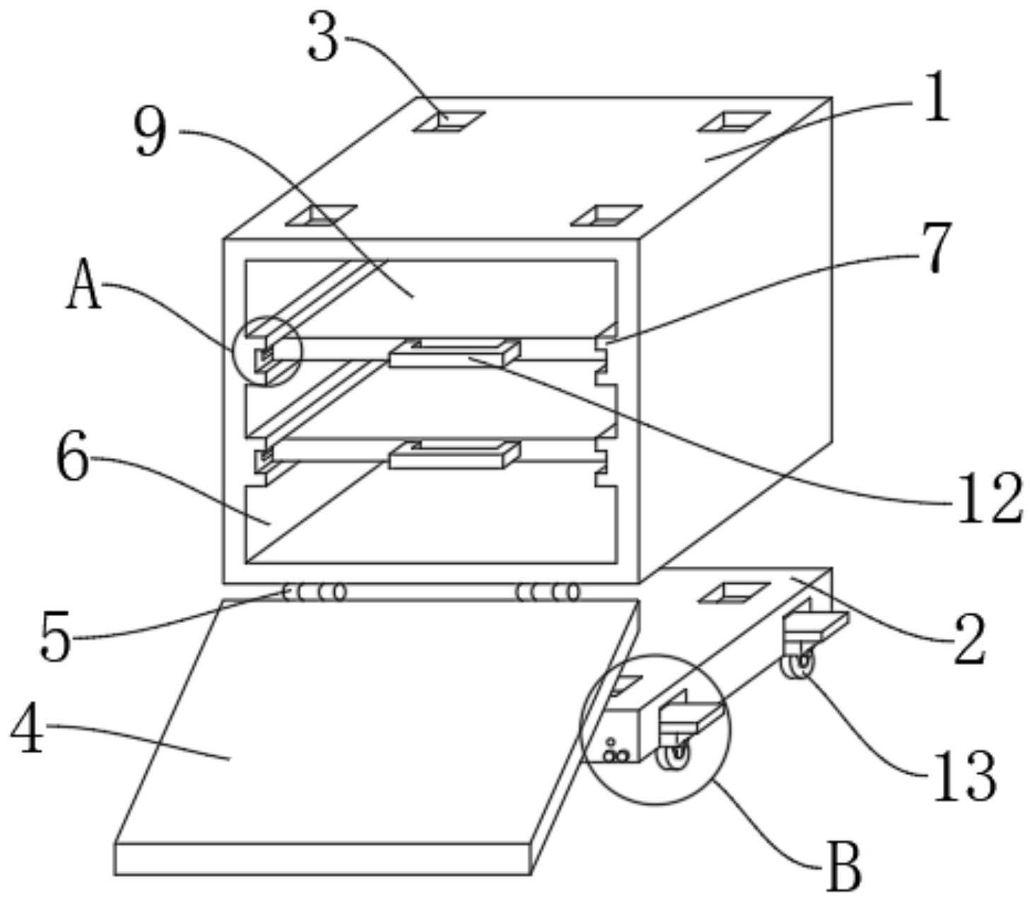本实用新型公开了一种鞋业制造容纳组合筐,具体涉及鞋业制造技术领域,包括筐体和安装板,所述筐体和安装板顶部均设置有卡槽,所述筐体一侧设置有挡板,所述挡板和筐体连接处设置有合页,所述筐体内部设置有空腔,所述空腔两侧内部均设置有安装块,所述安装块内部设置有第一滑槽和第二滑槽,所述第一滑槽内部设置有放置板,所述放置板两侧均设置有滑块,所述放置板外侧设置有把手,所述安装板四角下方均设置有移动组件。本实用新型不仅可使物料的储存和拿取更加方便,而且可随时切换安装座的固定姿态和移动姿态,使得物料储存时更加稳定,物料转运时更加省力。