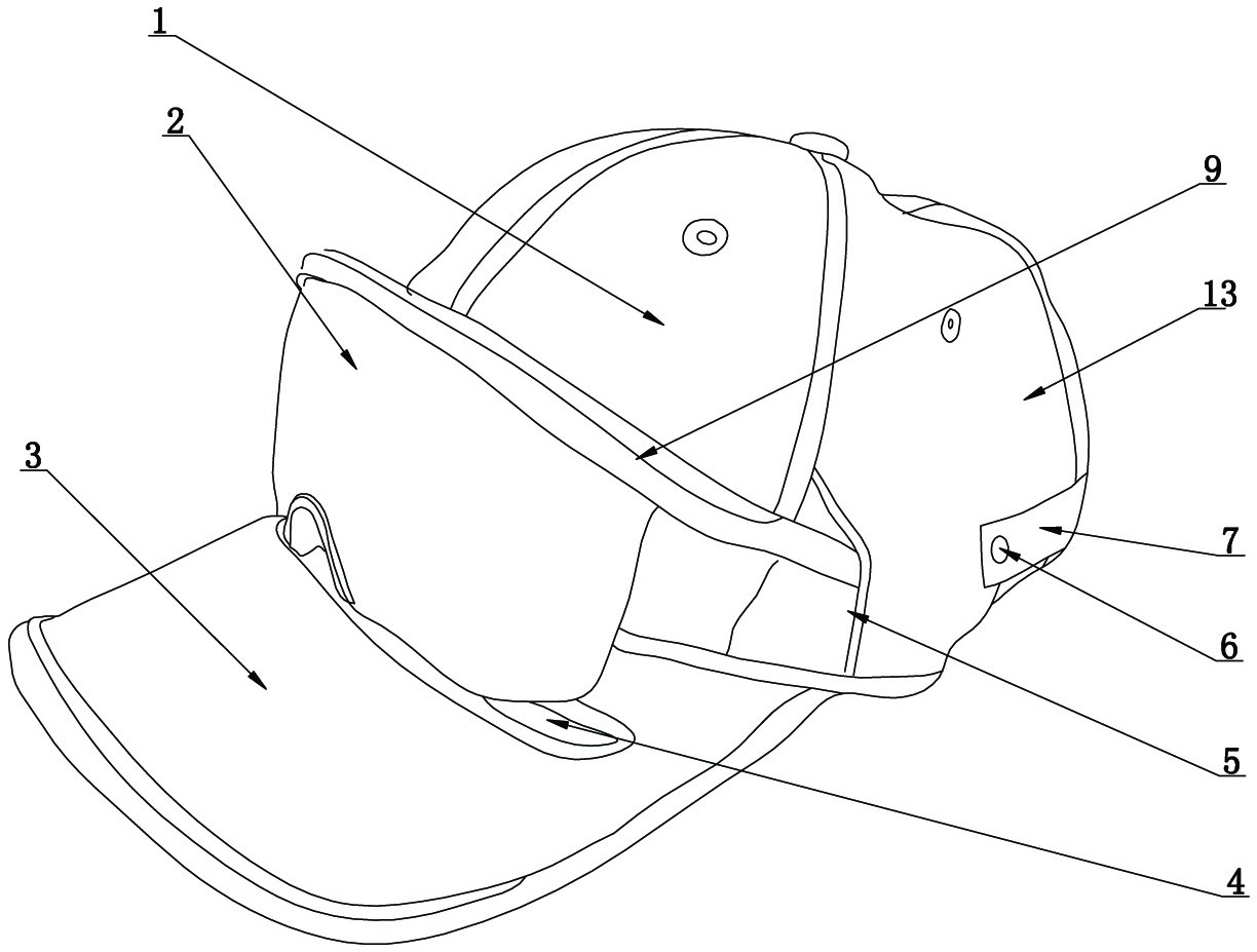 本实用新型涉及帽子制品领域一种多功能帽子,两侧镜腿的末端分别设置有固定装置一,眼镜固定在帽子本体的上方,眼镜框放置在帽檐上,帽子本体的内衬配合固定装置一设置有固定座一,两侧的镜腿分别穿过设置在帽子本体两侧的定位通孔并通过固定装置一固定设置在内衬的固定座一上;帽子本体的外衬还配合设置有绷带,固定装置二通过固定座二固定在帽子本体上,帽檐上配合眼镜框设置有导向孔;该实用新型提供一种多功能帽子,在帽子的帽檐上设置有可以上下调节的眼镜,同时在帽子上配合设置有绷带,在遮挡太阳光的同时,还可以将绷带戴在头上,防止汗液流进眼镜,方便使用,便于携带,而且保证时尚美观性。