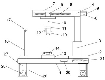 本实用新型公开了一种帽顶打扣机定位装置,包括底座,底座的右侧设有固定座,固定座的顶部安装有液压伸缩杆,液压伸缩杆的顶部固定连接有固定块,固定块的一侧固定连接有电机架,电机架中安装有旋转电机,固定块的另一侧固定连接有滑动架、螺纹杆、滑动块、冲压头、冲压座、定位块,定位块的两侧安装有红外线发射器,冲压座上设有和冲压头相对应的凹槽,冲压座上且位于凹槽的两边设有与红外线发射器相对应的红外线接收器,底座的左侧还设有万向管,万向管的顶部固定有激光射灯。本实用新型通过红外线发射器和激光射灯可以实现冲压头和扣芯的快速校准,提升打扣机的打扣效率。