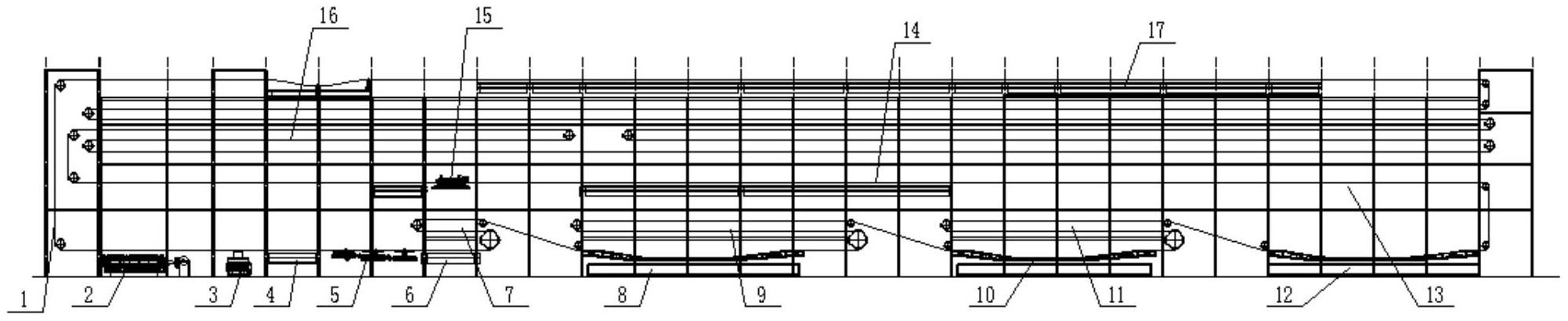 本实用新型公开了一种丁腈手套生产线,它属于丁腈手套领域,包括手模输送线,所述手模输送线上设有若干手模,按手模输送线输送顺序依次包括手模酸碱洗装置、手模滚刷装置、清水水洗装置、第一预烘干装置、浸凝固剂装置、第二预烘干装置、一次浸胶装置、第三次预烘干装置、二次浸胶装置、胶烘干装置、沥滤装置、卷边装置、烘干装置、后处理装置、脱模装置和点数包装装置;所述脱模装置,包括支架,所述支架上设有传输装置,所述传输装置上设有若干组导轨,每组所述导轨上均设有一脱模机械手,所述脱模机械手可在所述导轨上滑动,所述支架一侧设有滚刷,所述滚刷可与所述传输装置上的导轨接触,所述滚刷底部还设有吸尘装置。