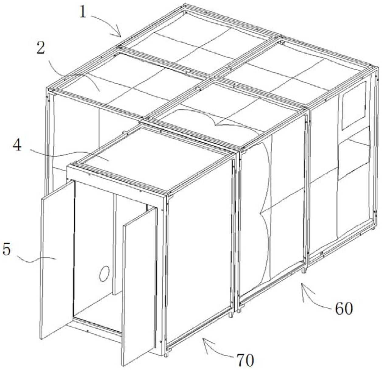 本实用新型涉及医疗设施技术领域,公开了一种快速装配式隔离病房,其包括第一隔离罩和至少两个框架结构,框架结构包括第一框架、第二框架和第三框架,第二框架与第一框架的侧边相连接,第三框架与第一框架的顶边相连接,且第三框架与第二框架的顶边相连接,第三框架具有第一连接座,相相邻的两个框架结构的第三框架通过第一连接座相连接,第一隔离罩与框架结构相连接,并形成隔离区。基于上述结构,框架结构相较于板材结构更为轻便,有利于隔离病房的快速搭建和部署,且拆装较为简单。另外,仅需第一框架、第二框架和第三框架即可形成框架结构,制造成本较低,且框架结构之间连接后相互配合使得本快速装配式隔离病房较为稳固,不易晃动或倾斜。