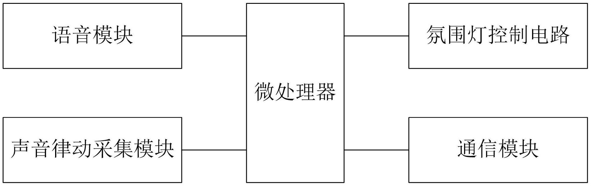 本实用新型具体涉及一种支持CAN总线及LIN总线的氛围灯语音控制系统,本氛围灯语音控制系统包括:微处理器、与所述微处理器电性相连的语音模块、声音律动采集模块、氛围灯控制电路和通信模块;其中语音模块、声音律动采集模块适于分别采集语音信号、音频信号至微处理器,微处理器适于根据语音信号或音频信号驱动氛围灯控制电路控制相应氛围灯的工作状态;微处理器适于通过通信模块接收外部设备的控制信号或向从机发送相应驱动信号;本实用新型通过设置语音模块、声音律动采集模块采集语音信号、音频信号,由微处理器对语音信号、音频信号处理后驱动氛围灯控制电路对车内氛围灯进行控制,方便驾乘人员操作氛围灯,并且氛围灯能够随着车内音乐律动。