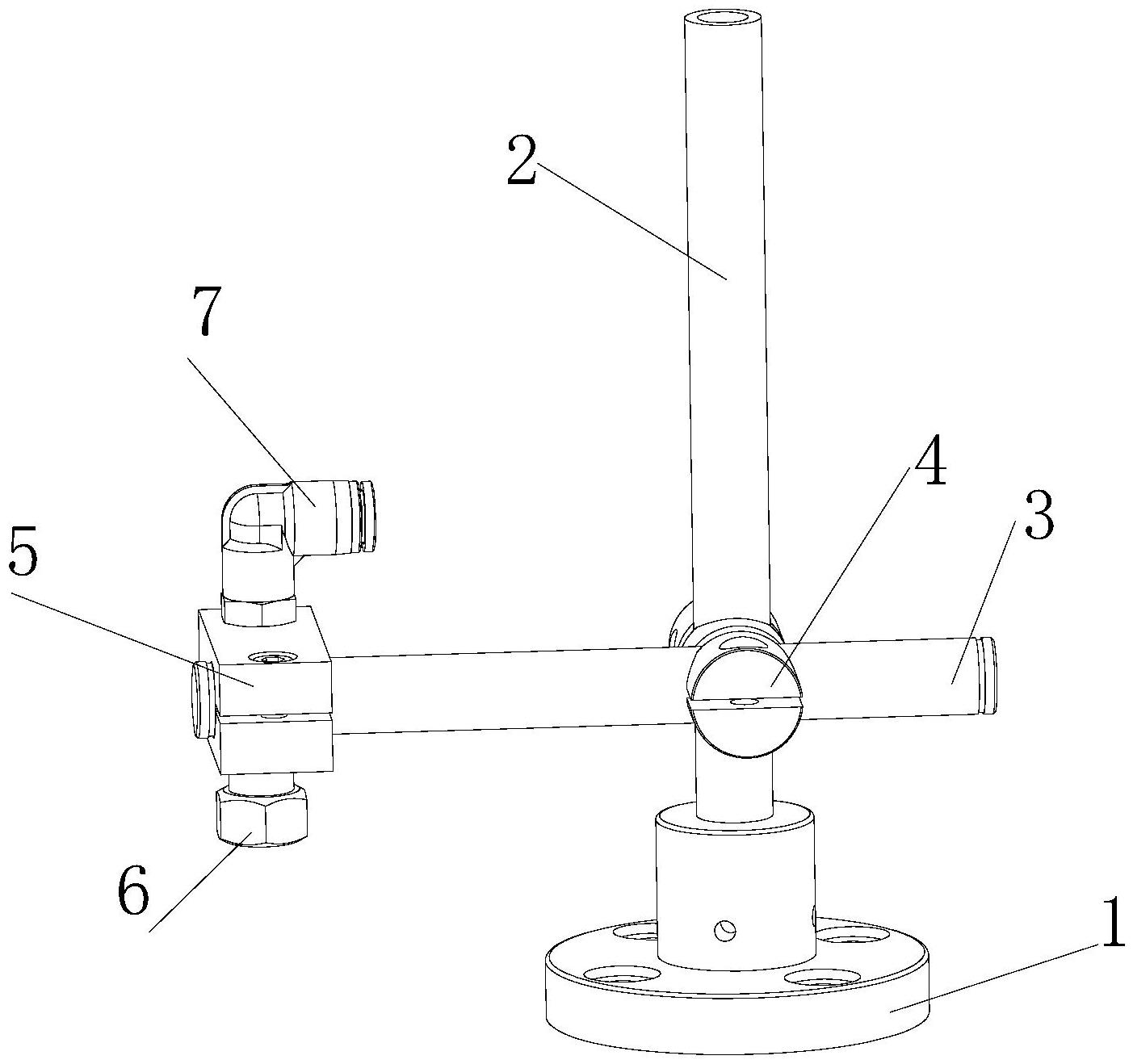 本实用新型公开了一种棉球喷胶机构,涉及喷胶设备领域;包括固定座、固定杆、导向杆、第一夹紧块、第二夹紧块以及喷嘴;所述固定杆的一端插入并活动固定在固定座的固定通孔内,所述第一夹紧块上沿不同方向设置有第一通孔和第二通孔,固定杆的另一端插入并活动固定在第一夹紧块的第一通孔内,所述导向杆的一端插入并活动固定在第一夹紧块的第二通孔内;所述的喷嘴固定安装在第二夹紧块上,第二夹紧块上设置有第三通孔,导向杆的另一端插入并活动固定在第二夹紧块的第三通孔内,喷嘴安装于第二夹块上。本实用新型的有益效果在于:代替人工手持喷枪,降低人工成本且喷胶不易出错。