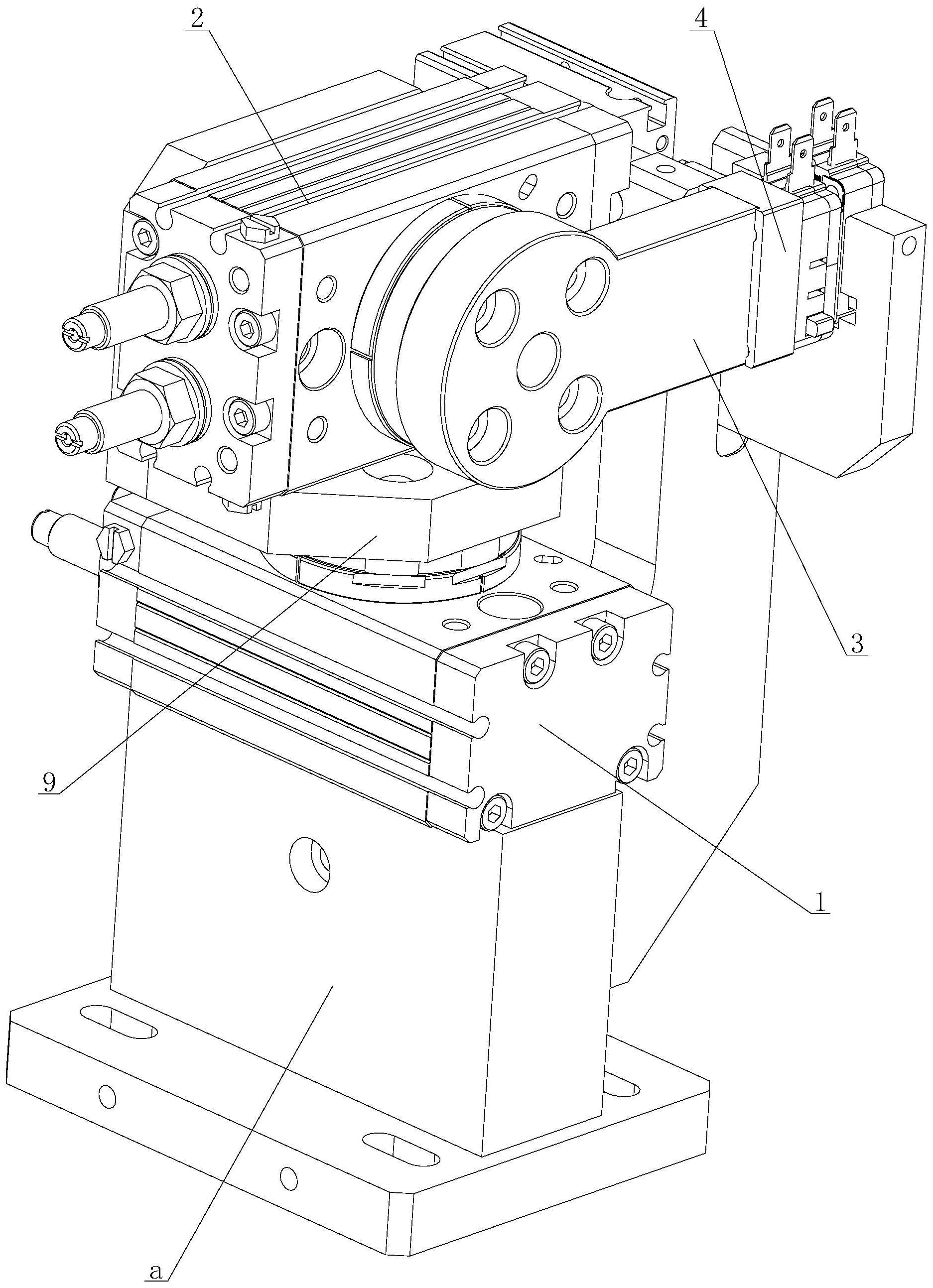 一种可改变微动开关方向的工装,包括第一驱动器、摆动组件、第二驱动器、旋转臂和夹具,第一驱动器驱动连接摆动组件,第二驱动器设置在摆动组件上,第二驱动器驱动连接旋转臂,夹具设置在旋转臂上;工装工作时,外部输送组件将微动开关输送到夹具上,第二驱动器通过旋转臂驱动夹具沿竖直方向转动,第一驱动器通过摆动组件驱动第二驱动器沿水平方向转动,以实现对微动开关方向的改变。本实用新型采用两个旋转气缸对微动开关进行两次旋转,第一次为竖直方向旋转,第二次为水平方向旋转,旋转完成后,可配合机械手夹持完成全自动安装微波炉开关托架的微动开关,从根本上解决传统手工组装效率低下、员工劳动强度大的问题。