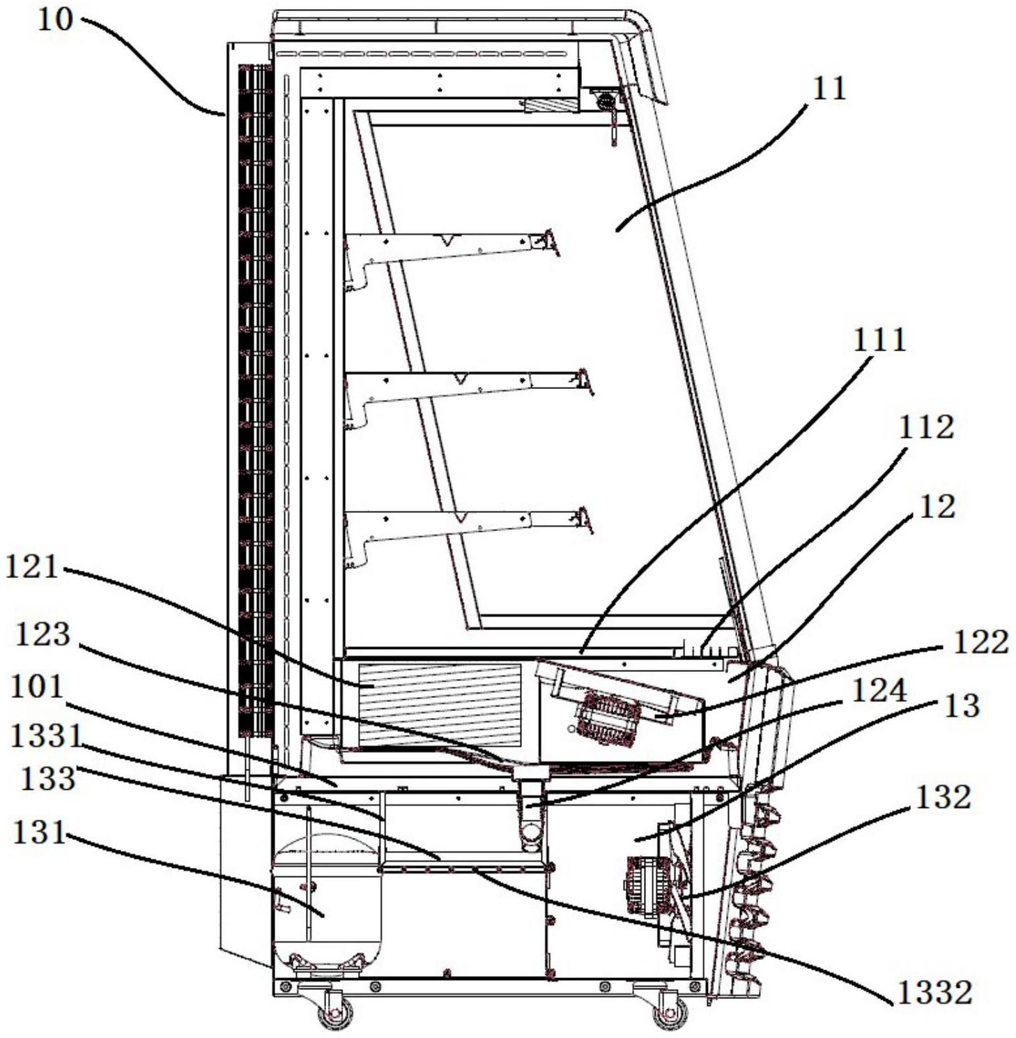 本实用新型提供了一种自动蒸发冷凝水的风幕柜,包括:柜体、设置在所述柜体底部的机械室,所述柜体被风道隔板隔成冷藏室和制冷室,所述制冷室位于所述冷藏室的下方,所述制冷室内设置有蒸发器、位于该蒸发器下面的集水器和第一风机,其中所述集水器用于收集所述蒸发器所产生的冷凝水;所述机械室位于所述制冷室的下方,所述机械室设置有冷凝器、第二风机和接水盘;其中,所述集水器的下端连接有漏水管组件,所述漏水管组件的下端延伸至所述机械室内,并与所述机械室内的所述接水盘连通,能够将所述冷凝水导流到所述接水盘中。本实用新型的蒸发冷凝水的装置即环保节能又给冷凝器降温降压,使得风幕柜的制冷效果更佳。