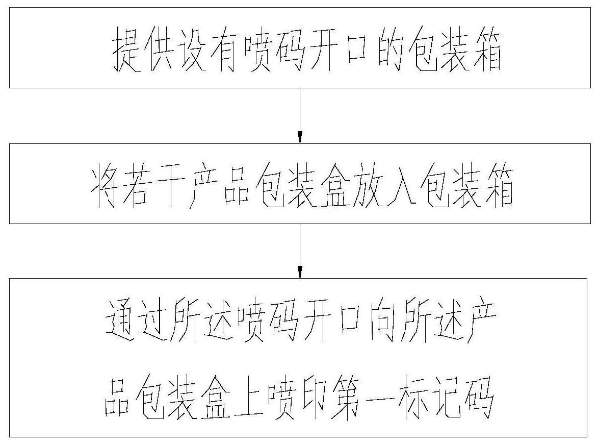 本发明公开了一种产品标记方法及装置。上述产品标记方法,在包装箱上设置喷码开口,在产品包装盒装入包装箱内后通过喷码开口对产品包装盒喷印第一标记码,保证同一包装箱内的产品包装盒上的标记完全一致,根据包装箱上的第二标记码生成第一标记码再将生成的第一标记码喷向产品包装盒,保证产品包装盒上的第一标记码与包装箱上的第二标记码之间相关联,后续容易对产品进行追踪。上述产品标记装置,将装有若干产品包装盒的包装箱放入传送台,传送台将包装箱送到喷印装置的下方通过喷码开口对包装箱内的产品包装盒进行标记处理,实现自动对包装箱内的产品包装盒进行标记处理。