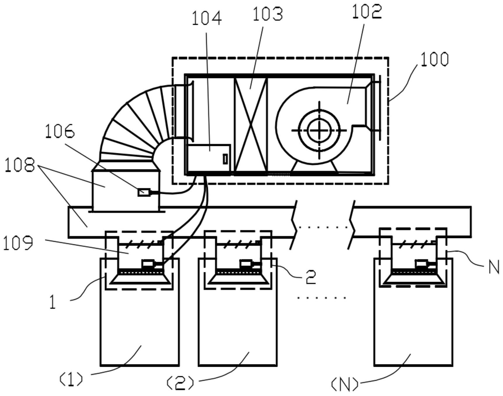 本发明提出了一种多联式油烟机及其控制方法,涉及吸油烟机设备技术领域。多联式油烟机包括:室外油烟主机、多个室内末端机、主路风道、多个支路风道以及检测模组。主控箱可以在获取到有至少有一个厨房中的室内末端机处于工作状态的信息后,控制风机以预设的初始转速开始进行抽风工作,厨房室内的油烟被抽入室内末端机经支路风道汇入主路风道中,后经室外油烟主机处理后排放至大气中。主控箱可以根据检测模组检测的参数对风机及风阀进行控制,使风机以合适的转速进行工作,风阀以合适的开度对风量进行调节,保证有较好的抽油烟的效果的同时节约能耗。同时因室内末端机中没有安装风机,运行时不会产生过大的噪声,保证厨房内环境的舒适性。