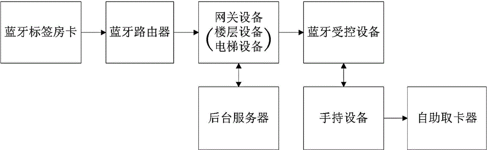 本实用新型提供了一种酒店入住控制系统,包括后台服务器、蓝牙标签房卡、蓝牙路由器、网关设备以及自助取卡器;所述蓝牙路由器分布于酒店的各个位置,用于感测所述蓝牙标签房卡信号强度值并发送至网关设备;所述网关设备连接互联网络后桥接管理服务器,与蓝牙标签房卡、蓝牙路由器及蓝牙受控设备进行过组网设置,并根据接收到的信号强度值来定位蓝牙标签房卡所处的位置;蓝牙受控设备通过无线蓝牙传输数据功能来执行网关设备发送的控制指令;自助取卡器设在酒店大堂并能与手持设备对接,在输入客户身份证信息后弹出一个蓝牙设备房卡。本实用新型基于蓝牙系统实现酒店迎宾引导,且能很好的与手机等手持设备很好的相结合,使应用功能得到了拓展。