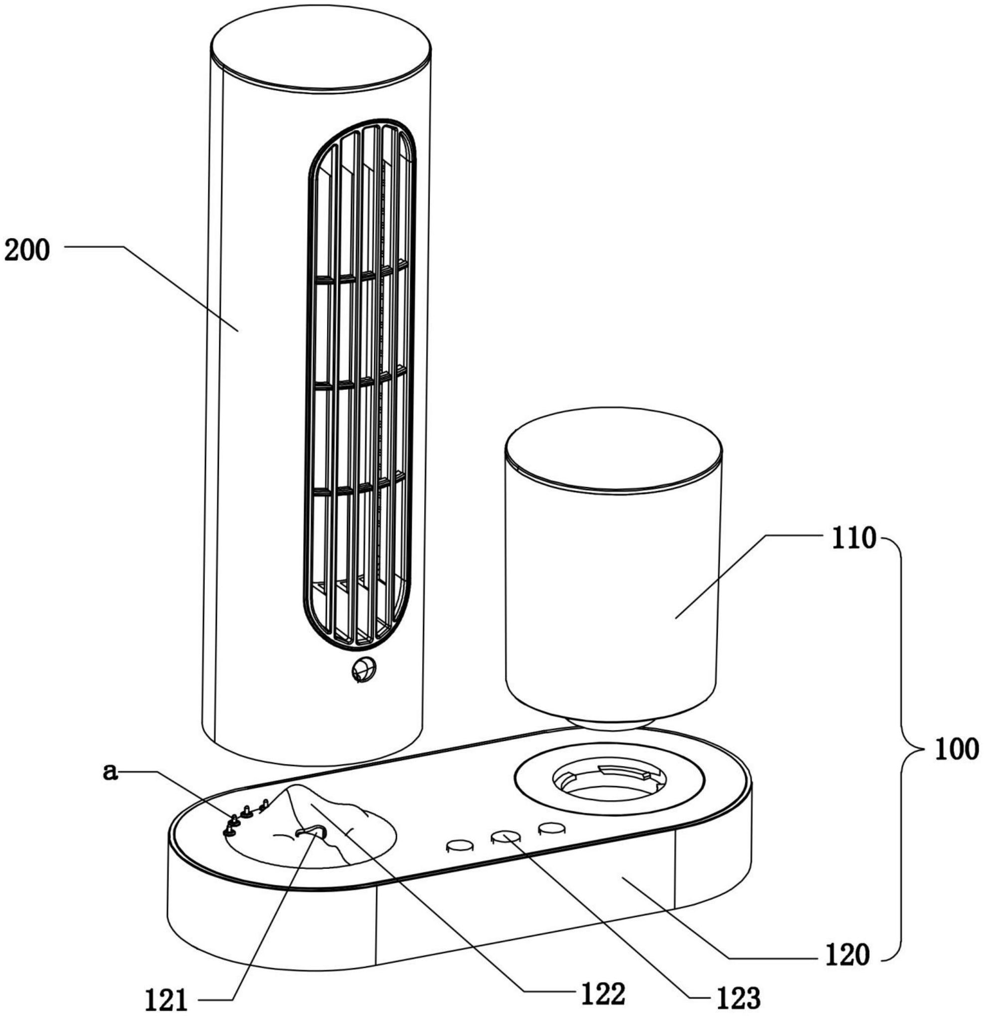 本实用新型涉及一种多功能加湿桌面扇,包括加湿主体和风扇主体,加湿主体上设有能够与风扇主体连接的安装部位;风扇主体上设有与加湿孔连通的出雾通道;风扇主体不安装时,加湿主体单独工作,从安装部位喷出蒸汽;风扇主体安装到加湿主体上,风扇主体能够单独工作或者和加湿主体同时工作。本实用新型的有益效果在于:1.与现有技术相比,本实用新型将风扇主体可拆卸安装到加湿主体上,可以单独使用加湿器,也可以作为风扇主体的加湿功能使用,满足不同环境下的不同需求;2.将风扇主体和底座之间设置快插结构,使风扇主体和底座的连接之间不设置导线,避免了导线收纳不便和连接不稳定的问题。