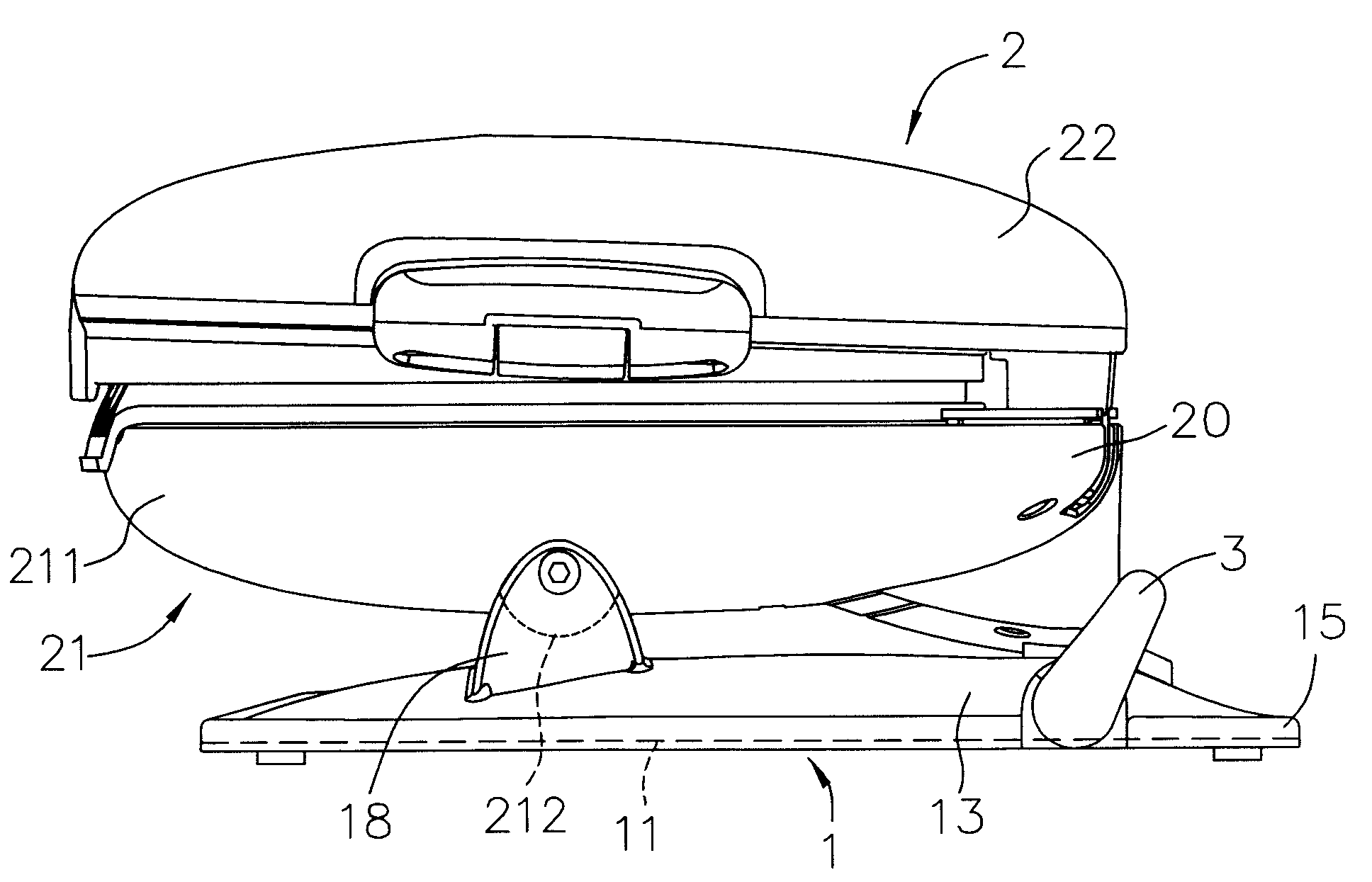 本发明公开了一种可调整倾斜状态的煎烤器,包含一底座、一可枢摆地架设在底座上的烤盘单元,以及一架设在底座及烤盘单元间的顶撑机构,该烤盘单元具有位于枢设部位相反侧的一第一端及一第二端,而该顶撑机构包括一可被操控旋转的转控杆,上述转控杆具有一段枢设在烤盘单元的第二端上的弯控部。当弯控部在一第一位置时,该烤盘单元的第一端和第二端之间有个高度差,以便使烘烤食物产生的流体能够往下流,而当弯控部转换到一第二位置时,该烤盘单元的第一端及第二端大致等高,而使得流体能够均匀地分布在食物上。