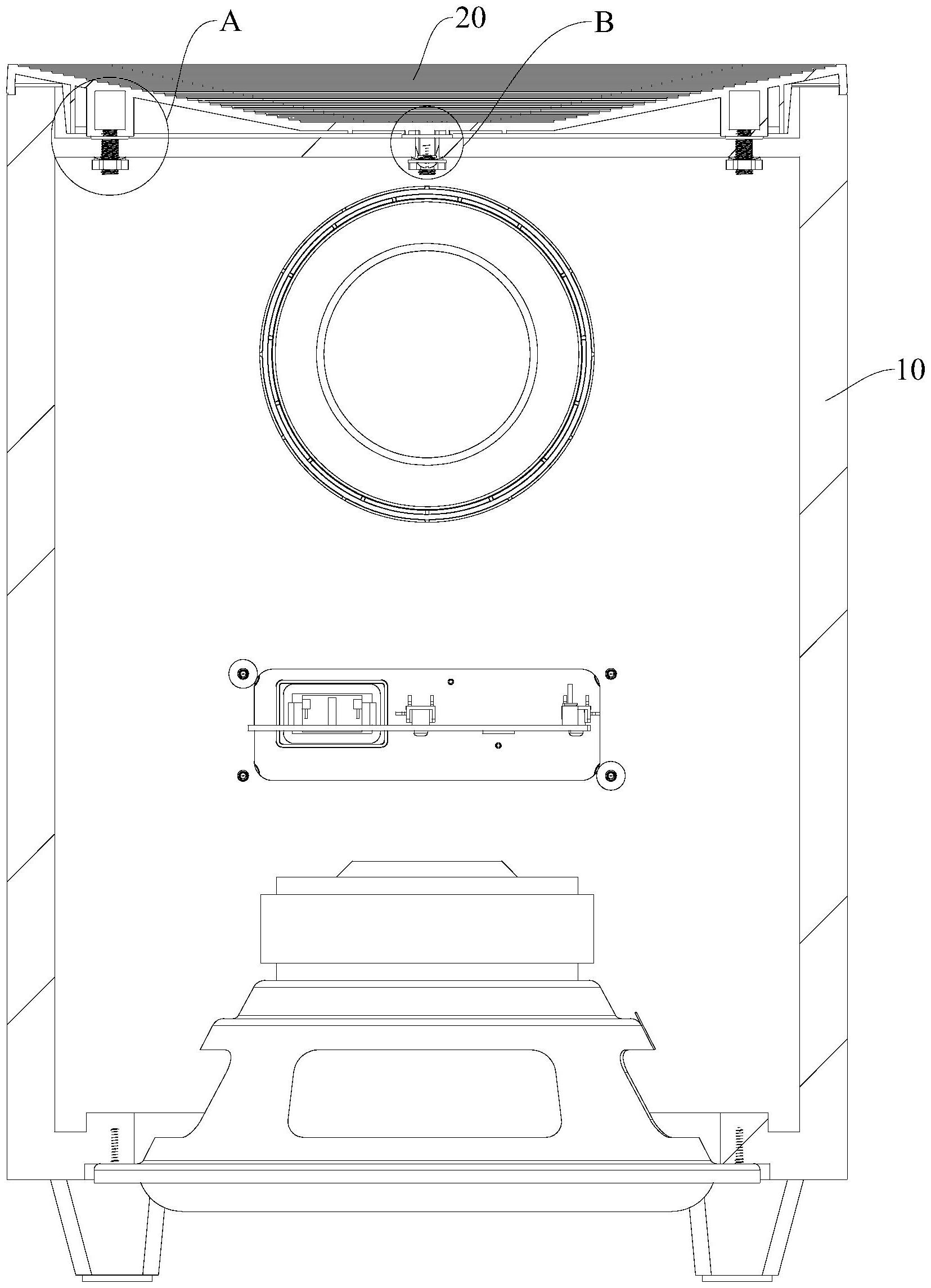 本实用新型公开了一种便于拆装的音箱箱体及音箱,包括:木质主体,设有内腔以及和内腔连通的多个第一连接孔;塑料盖板,盖设于木质主体上,设有多个螺柱,各螺柱一一对应的插设于各第一连接孔并伸入内腔中;多个第一密封垫,各第一密封垫一一对应的套设于各螺柱上,且第一密封垫夹设于木质主体和塑料盖板两者之间;多个螺母,各螺母一一对应的和各螺柱位于内腔中的一端螺接;以及多个第一弹簧垫片,各第一弹簧垫片一一对应的套设于各螺柱上,且第一弹簧垫片夹设于木质主体和螺母之间。其装配精度低,并省去了灌胶步骤,组装更便捷,而且为可拆装结构,在拆卸时不会造成木质主体和塑料盖板损坏,便于维修。